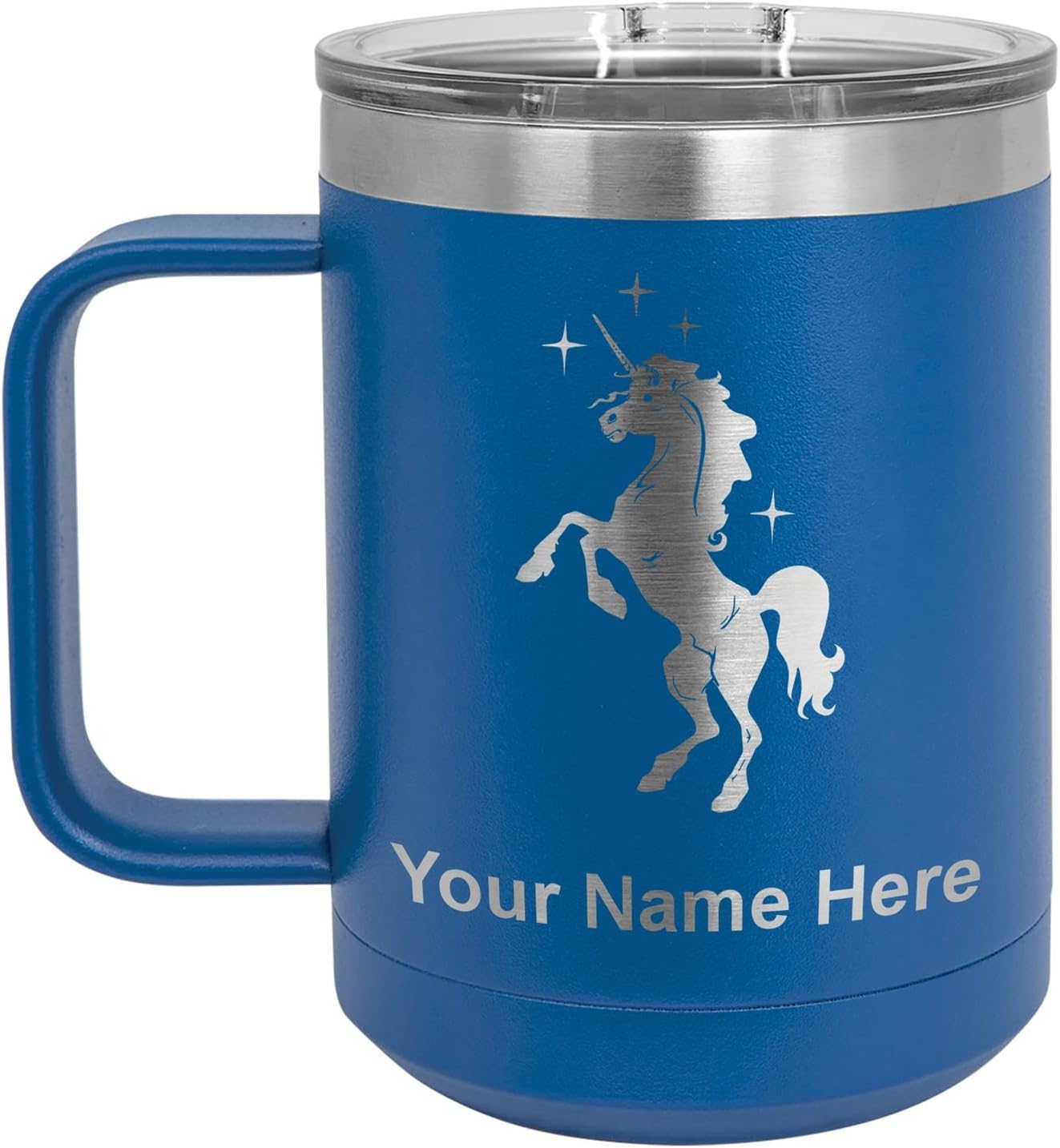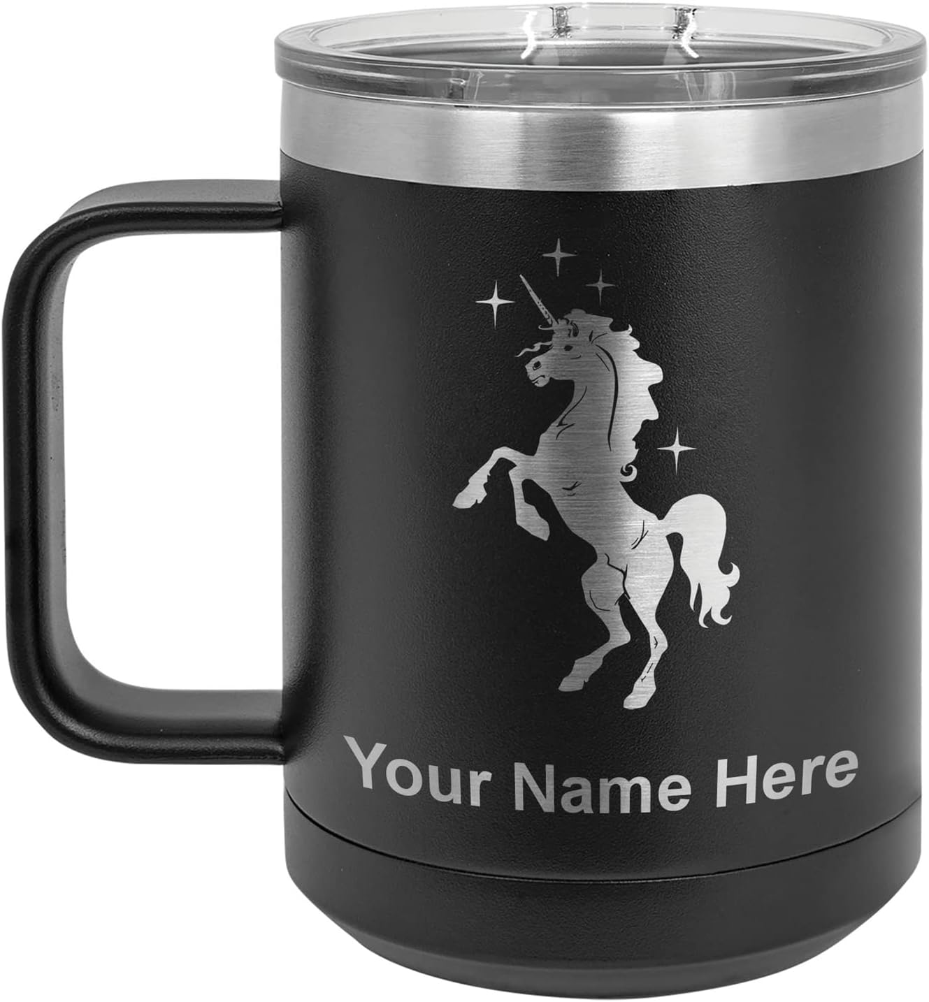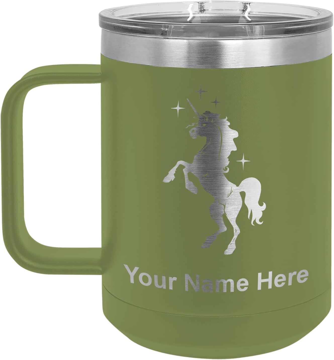 LaserGram 40 ounce Travel Mug with Handle that is laser engraved with the image that you see in the photo. Your own personalized text will be laser engraved below the image. Features double-walled stainless steel vacuum insulation with a clear lid. Click the "Customize Now" button to begin customizing your mug.