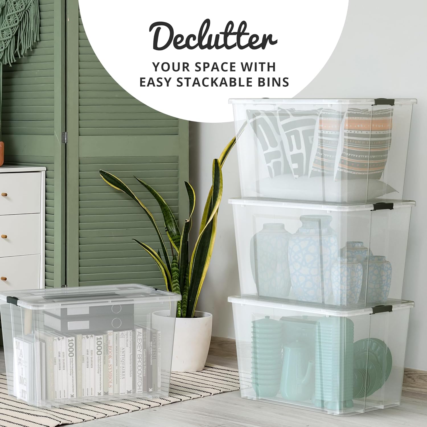 Plastic Storage Bin Tote Organizing Container with Ultra Durable Lid and Secure Latching Buckles, Stackable, Extra Strength Clear with Handle