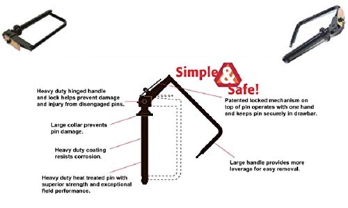 Patented locked mechanism on top of pin operates with one hand and keeps pin securely in drawbar. Large handle provides more leverage for easy removal. Heavy duty hinged handle and lock helps prevent damage and injury from disengaged pins. Large collar prevents pin damage. Powder coated finish resists corrosion. Heavy-duty, heat-treated pin with superior strength and exceptional field performance.