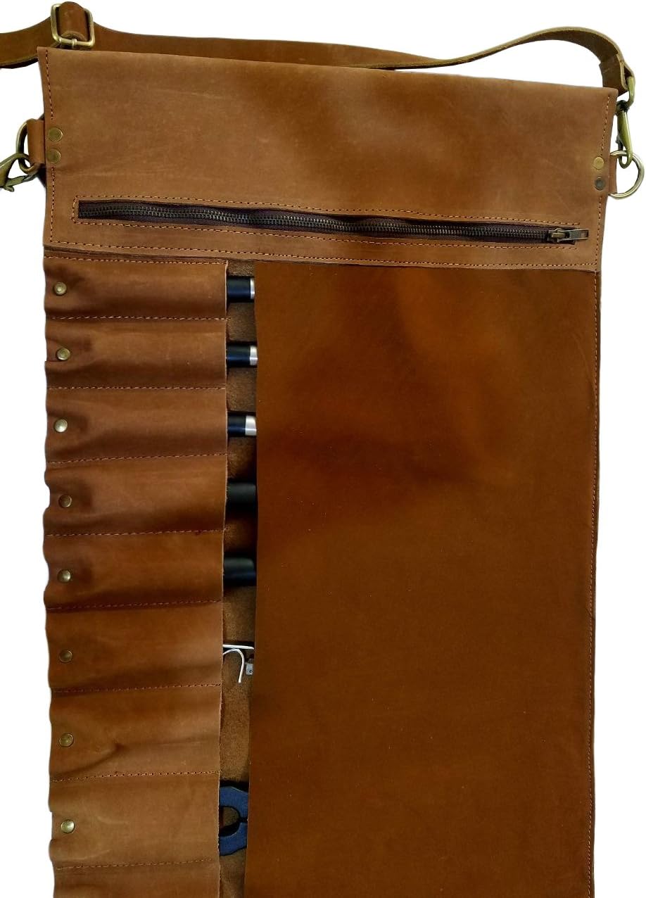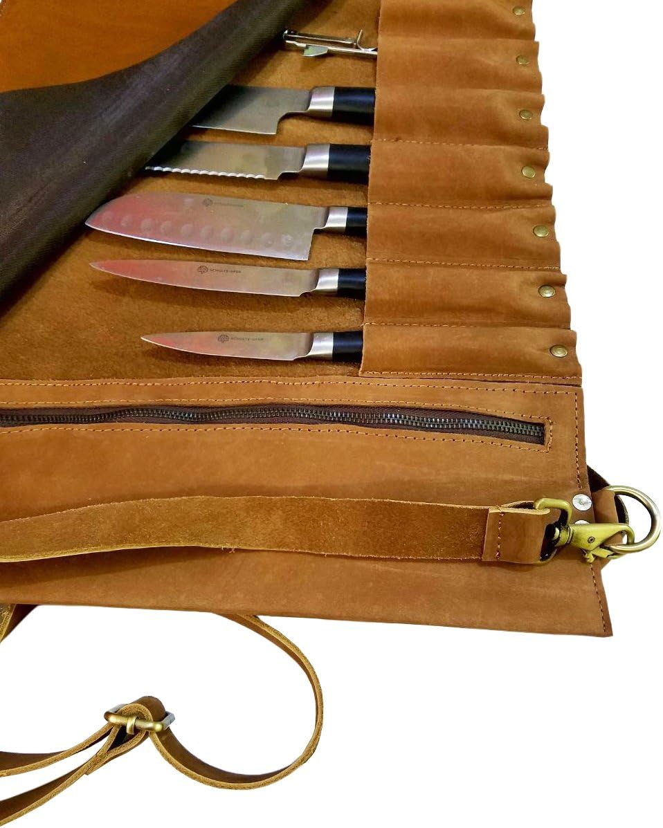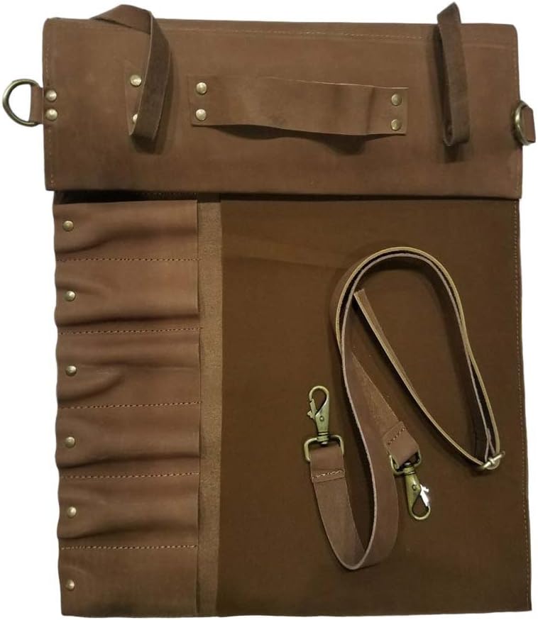 Professional Leather Chef Knife Bag- Perfect For Professional Chefs and Culinary Students Easiest and great way to store and transport your knives safely This bag is made of Lightweight premium leather and includes an adjustable leather straps Perfect knife space with 10 pockets to hold and secure your knives firmly