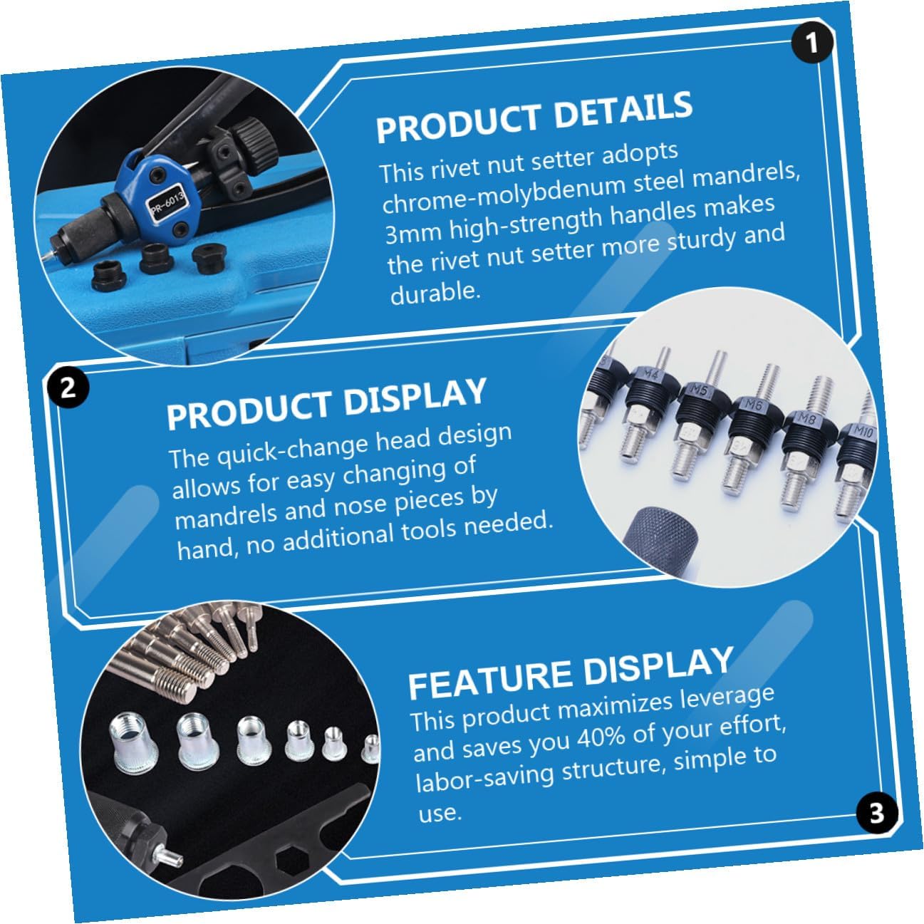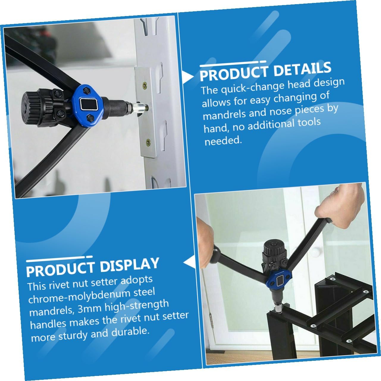 Package Include 1 × Toolbox 1 × User Manual 1 × Wrench 1 × Riveting Machine 7 × Mandrels 130 × Rivet Nuts Features -Size: About 32.70X15.50X3.00cm/12.85X6.09X1.18in. -Product Info:Rivet machine kit -Material: Chromium molybdenum steel, aluminum alloy. -Color: Assorted. - The rivet tool kit has multiple interchangeable mandrel groups and various sizes of rivet nuts, which can ensure that all your needs are met - The rivet nut tool is a combination of multiple design concepts that are simple to use and labor-saving, flat threaded rivet nut. - Wide range of applications, it can be reinforced such as bicycles accessories, body panels, furniture accessories, etc rivet nuts. - The tool is made of quality material. Excellent design structure and hard material to extend the service life. - Excellent when access to the rear of the panel is , very suitable for sheet metal processing hand rivet nut tool.Goods Descriptionrivet for metal Reasonably designed installation tools provide you with a comfortable experience.rivet nuts assortment kit With a pack of useful and strong mandrels with different size, it brings great convenience to your installation work.nut insert tool kit Made of and sturdy materials, this nut installation tool kit is sturdy, durable and safe
