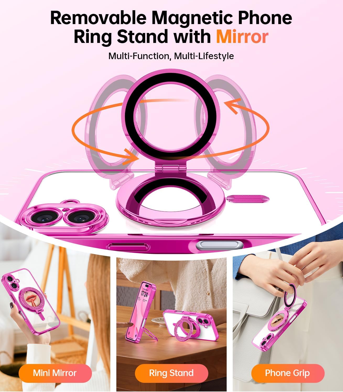 | Additional Features | ①Magnetic case for iPhone 16 + Phone Ring Holder ②360° Rotation & 180° Angle Adjustment ③Phone Holder Built-In Mirror ④With Glitter Card and Wrist Strap ⑤Strong Magnetism ⑥Remove Phone Holder for Wireless Charger |