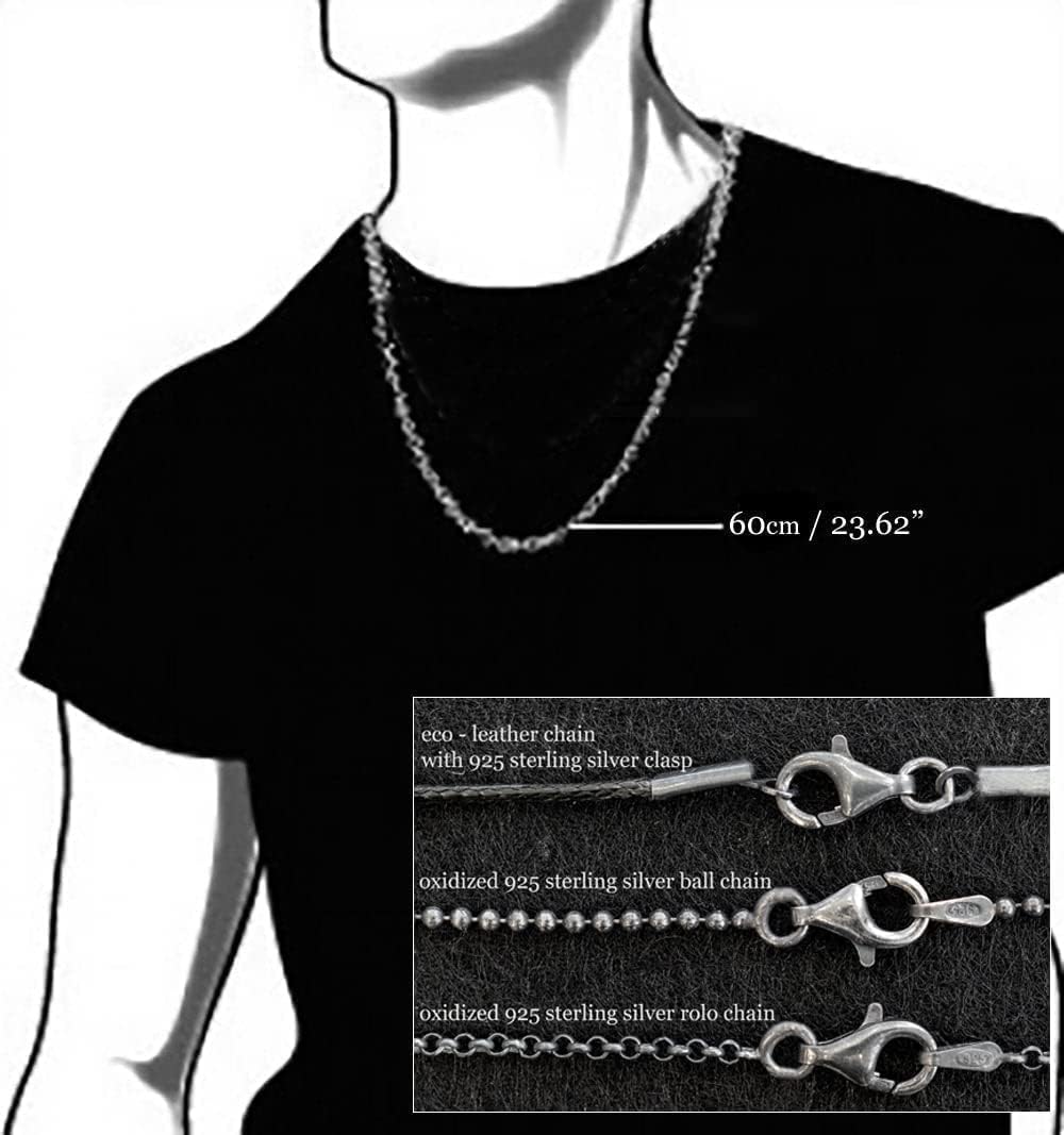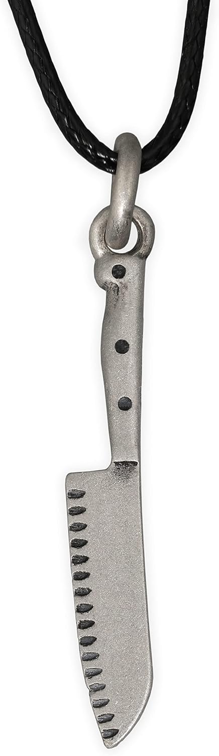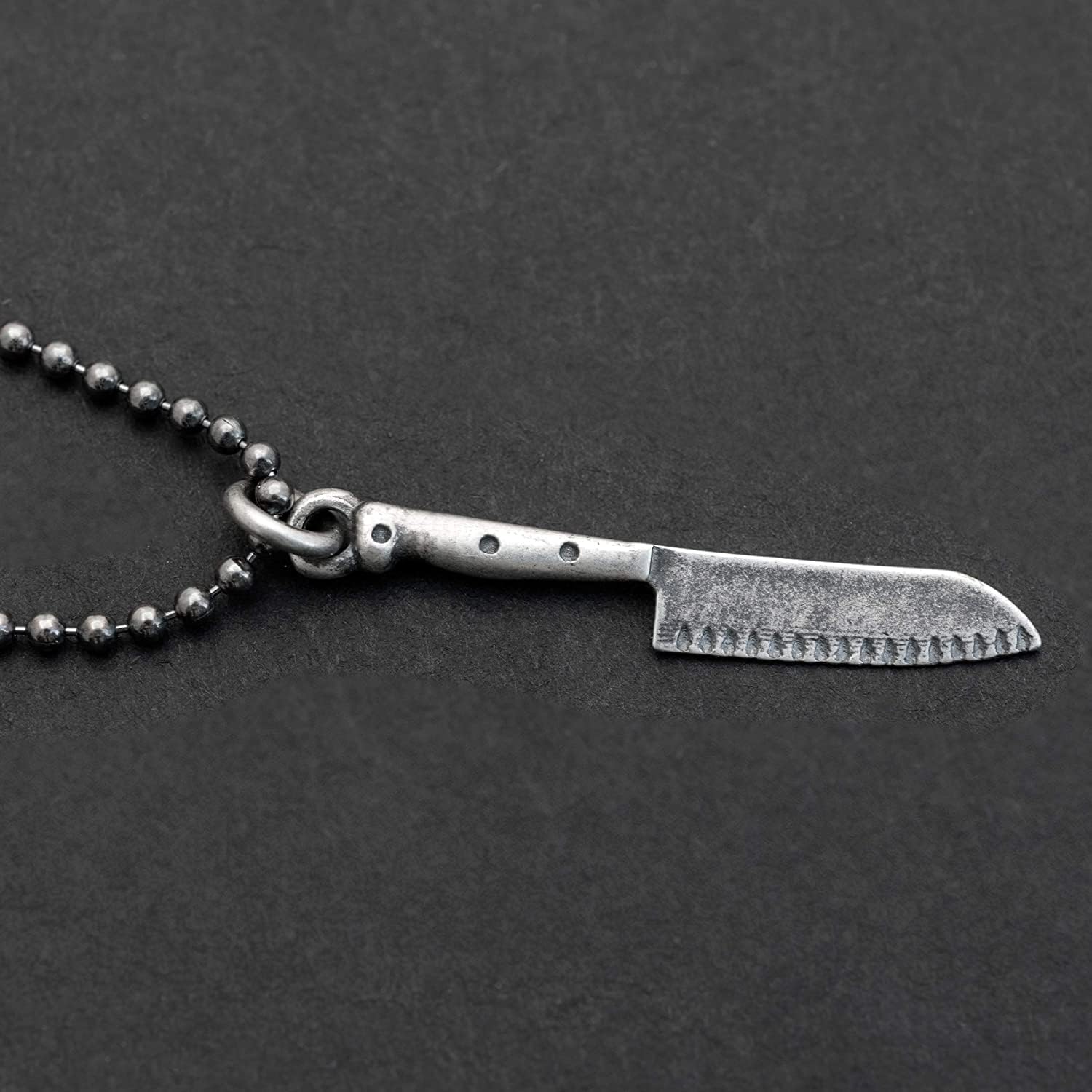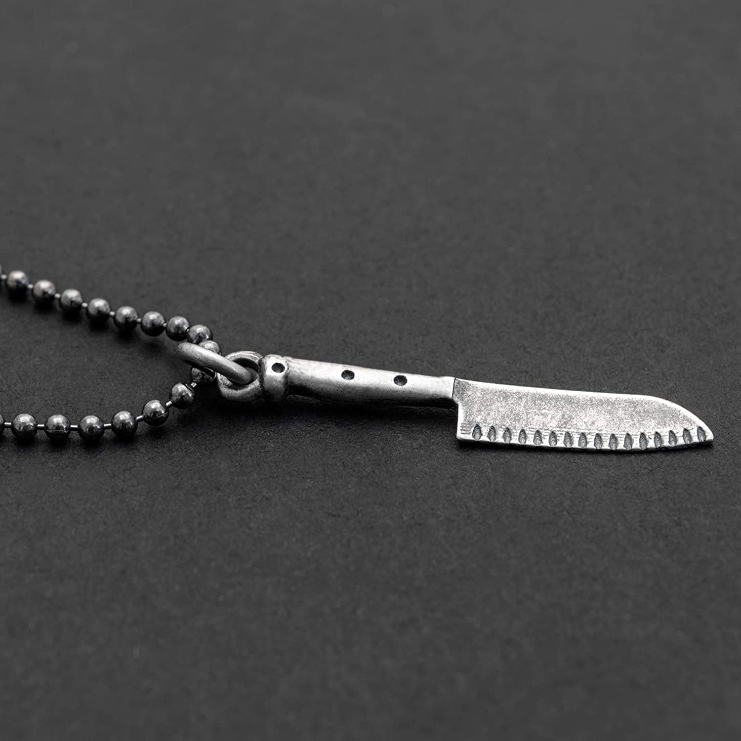 There's jewellery that adorns, and pieces that make declarations. This kitchen knife pendant commands attention with its bold culinary edge and gothic sensibility. For chefs, cooks, and devotees of darker culinary arts, it's an uncompromising statement piece that refuses anonymity.Meticulously crafted from 925 sterling silver and deliberately oxidised, creating distinctive dark patina that accentuates every contour. This oxidation process bestows the pendant with antiqued finish whilst rendering it tarnish-resistant. Standing at 29mm height, this substantial piece possesses genuine weight and presence, with each knife bearing unique character variations from traditional handcrafting.This transcends mere jewellery—it's culinary rebellion worn as personal manifesto. The gothic aesthetic transforms everyday kitchen implement into arresting statement celebrating darker artistry of cooking. For culinary professionals, biker chefs, and alternative fashion devotees navigating between kitchen and street, this pendant bridges worlds seamlessly. The oxidised finish delivers raw, industrial edge complementing leather jackets as naturally as chef whites. Ideal for professional cooks showcasing passion beyond the pass, or meaningful tribute for culinary graduation, new restaurant ventures, or anyone approaching cooking as craft and artistic expression.Arrives in premium sustainable packaging including presentation box, velvet pouch, and branded paper bag. Handcrafted in Greece by Emmanuela Alevizopoúlou, each piece individually created with meticulous attention.Weight: 0.80g | Height: 29mm | Width: 4mm | Available with choice of sterling silver ball chain, rolo chain, or eco leather cord (60cm), all featuring sterling silver clasps. 925 sterling silver with intentional oxidation treatment. Handcrafted with passion—because authentic beauty remains eternally personal.