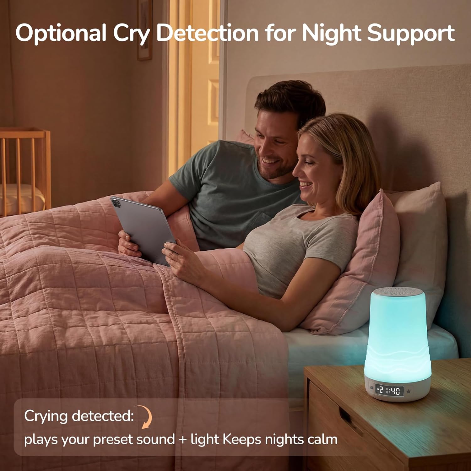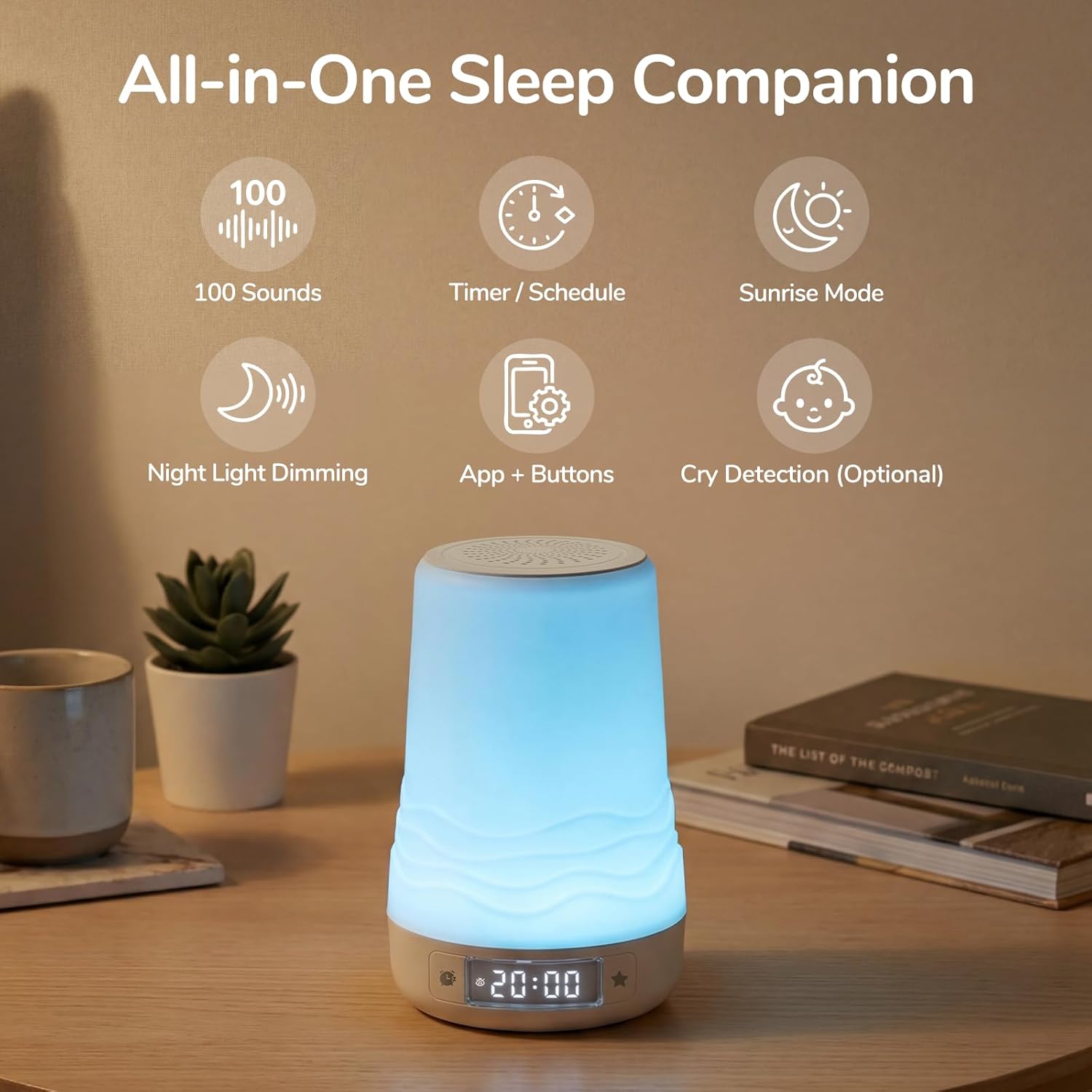 Accessories: -Charging Cable -Instruction Manual -Voice Card -Minimal Design Sticker This voice-activated night light is designed to create a calm, comfortable sleep environment for adults, while still offering gentle support for baby care when needed. With a 2W LED light and a rechargeable 2600mAh battery, it delivers soft ambient lighting and up to 6–8 hours of soothing sound—ideal for winding down, uninterrupted sleep, and quiet nighttime routines at home or while traveling. Featuring 100 carefully selected sounds and an included voice card, this sound machine supports relaxation, noise masking, and consistent sleep habits. Its intuitive design allows quick setup and easy adjustments, whether you’re preparing for sleep, resting through the night, or responding calmly during nighttime moments. A balanced combination of light and sound helps maintain a peaceful atmosphere without overstimulation. Product Details: Dimensions: 165*110*110 mm Net Weight: 415g Package Dimensions: 178*113*111 mm Battery Capacity: 2600 mAh Charging Time: 2 hours Full Charge Duration: 6-8 hours Function: 2W Color: White Voice Quantity: 100