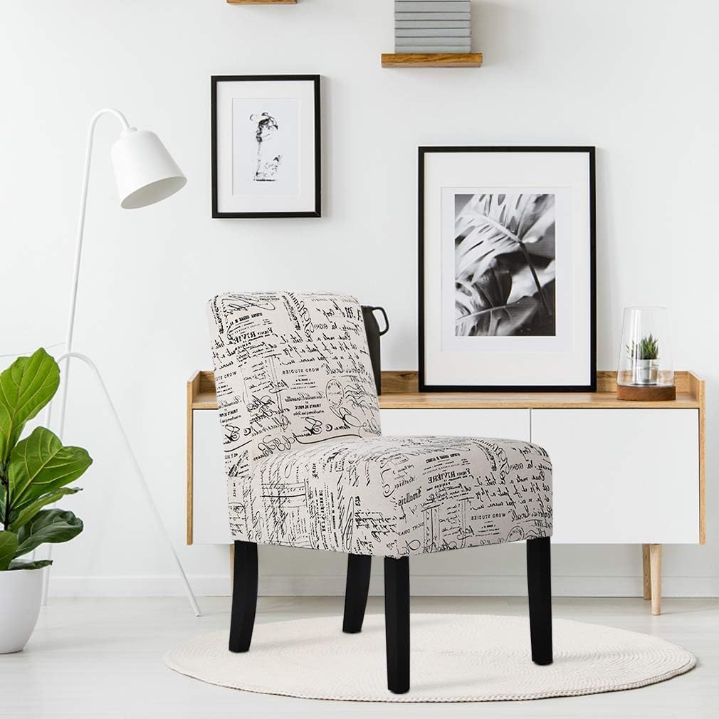 Modern polyester fabric armless chair, perfect as an accent living room piece or a reading nook. Features soft fabric upholstery with generously padded Sponge and dark wooden legs with comfortable back and seat cushion. Reveal this furniture piece a touch of modernism. Simple yet sleek design to best fit your space.Feature:Charming & comfortable: Padded with numerous high-resiliency foam, accent chair brings yourself into a state of relaxation.EASY TO SET UP: Finish the accent chair in 5-10 minutes.GOOD QUALITY: Durable sofa chair hard wood frame and floor protection.DURABLE HARD WOOD FRAME: Excellent performance of strength and white color fastness accent chair.Specifications:Accent Chair Overall Dimensions: 28"D x 20.9"W x 30.7"HLegs: Pine Wood in Dark FinishingUpholstery: Fabric and FoamColor: WhitePackage: one pack