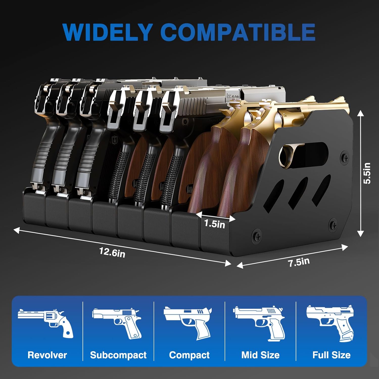MoKo Pistol Rack for Safe Gun StorageWidely Applicable· Available in 6/8 slots to meet different storage needs· 1.5-inch wide slots fit most gun sizesHigh Quality Material· Made of premium PVC plastic and foam board· Sturdy and long-lasting, not easy to deform after long time useSafe Storage· Stable structure to prevent the gun from sliding or tipping· Enhanced storage securityPractical Design· Quick to assemble without complicated tools· Includes cleaning rod and pads for easy maintenance of pistolsGift & Display· Neatly store and perfectly display your pistols· Suitable for personal use or as a gift for gun enthusiastsSpecificationsMaterial: PVCDimensions: 10 × 7.6 × 5.5 inches (6 slots); 13 × 7.6 × 5.5 inches (8 slots)