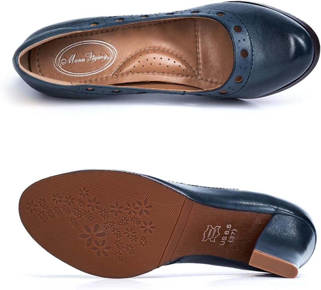 No road is long with good company, No road is long with good shoes. Mona Flying shoes are such good company, supporting you every step of the way, offering the best possible wearing experience. Leather Pump Highlights: ★Rich sheepskin uppers offer a superior wear experience and a chic look. ★Soft breathable leather lining and Non-removable insole provides all-day comfort and freshness for your feet ★8cm(3.15 inches) classy round toe dress pumps offers you elevation without compromising comfort ★Rubber outsole with a leather welt ensures stablity and durability yet incredibly lightweight ★Purely handmade leather pumps, classic and stylish, effortlessly fit your work-to-weekend outfits Attention 1. Make sure you have carefully checked the size chart before you purchase, choose normal size you wear. 2. Color variation. · Due to shooting light, shooting angle and monitor displays, the pictures and the items may be slightly off color. · Since the pumps are purely handcrafted, there might be minor flaws which can't be ruled out, but won't affect its beauty and comfort.Package Each shoe will be wrapped up separately by bag in one box.