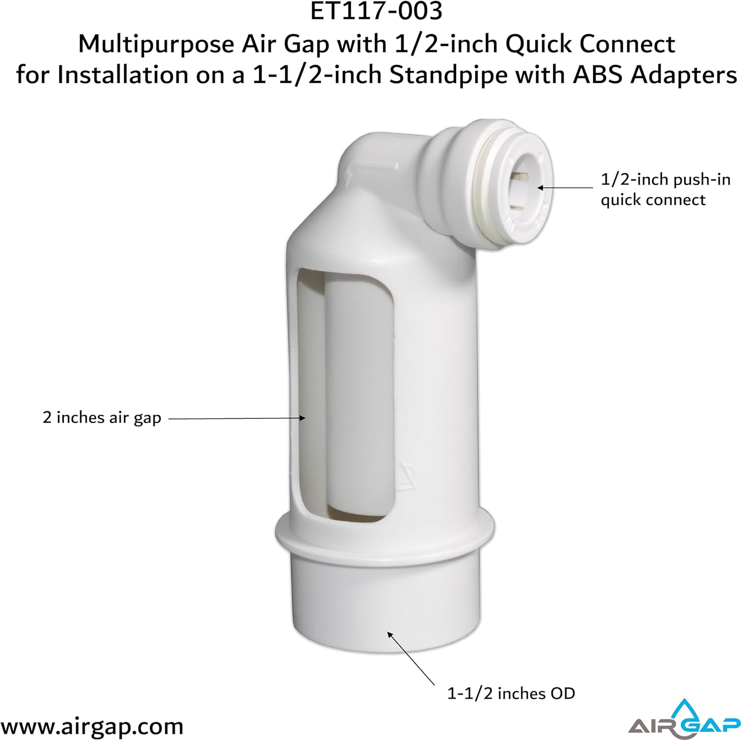 The ET117-003 multipurpose air gap is designed to provide a convenient way to install an air gap into a 1-1/2-inch standpipe drain. This air gap can be connected to a water filtration system using flex tubing. The air gap’s splash-resistant design protects the air gap’s surroundings from water damage. The inlet accommodates flex tubing for leak-proof installation in tight spaces. The right-angle inlet provides a convenient way of connecting discharge water tubing to a drain line. This air gap is easy to use and legal to install in any state. The ET117 series air gaps are listed by UPC (Uniform Plumbing code) and IPC (International Plumbing Code) listed.