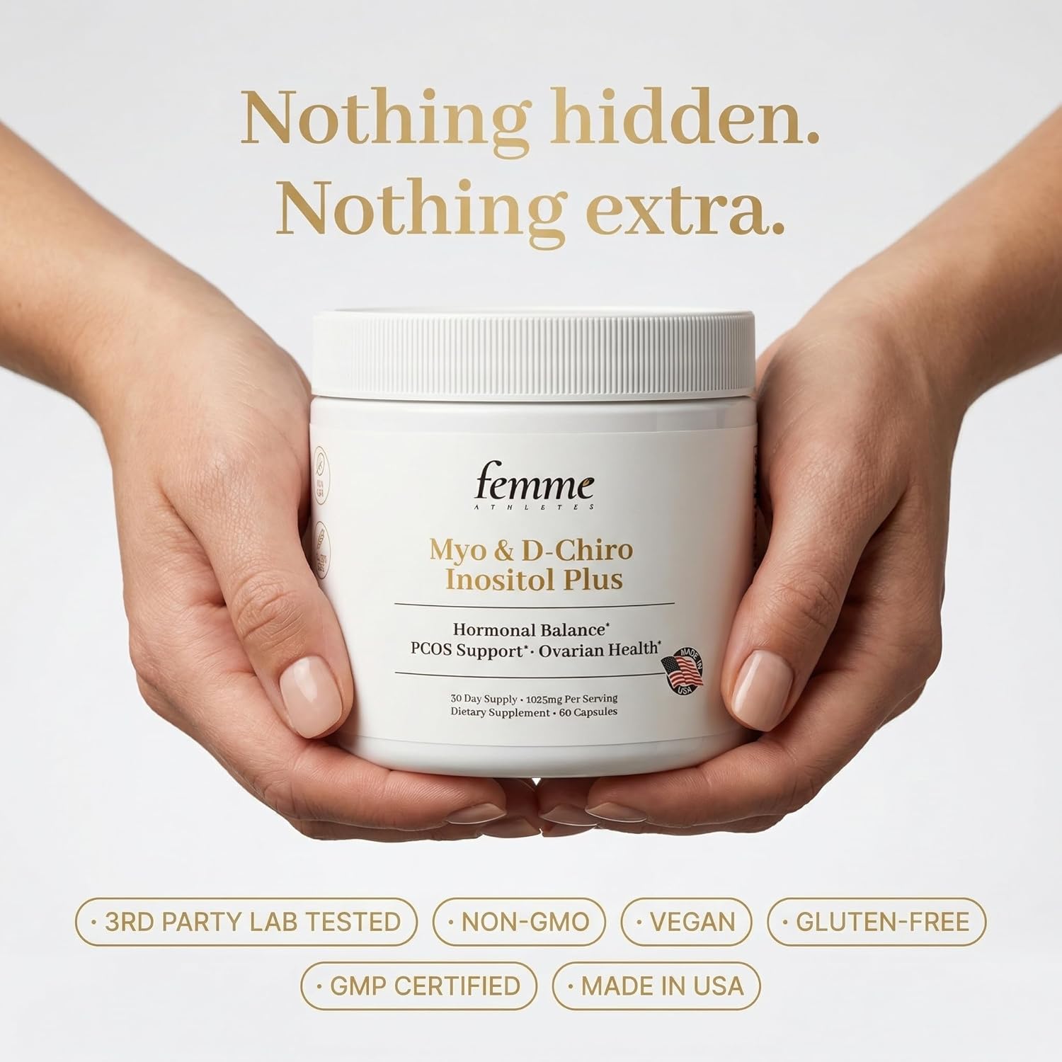 Mood swings. Irregular cycles. Hormonal breakouts. Cravings you can't explain. They're not random — they're connected. FemmeAthletes Myo & D-Chiro Inositol Plus delivers 1025mg at the 40:1 ratio, featuring Caronositol — a patented D-Chiro Inositol derived from carob. Part of the BalancePath System, it supports multiple connected pathways in one simple daily routine. WHAT YOU MAY NOTICE More stable mood throughout the month More consistent, predictable cycles Fewer sudden cravings Skin that feels more balanced A body that feels more in sync WHAT IT SUPPORTS Hormonal balance and ovarian function More consistent, predictable cycles Mood stability and emotional balance Clearer-looking skin through hormonal and metabolic support Craving and appetite balance WHY THIS FORMULA 40:1 Myo & D-Chiro Inositol ratio Includes Caronositol (patented D-Chiro Inositol from carob) Designed for women’s hormonal pathways Built as part of a complete system, not a quick fix CLEAN & TRUSTED Non-GMO | Vegan | Gluten-Free | Sugar-Free GMP-Certified | Made in USA 60 Capsules | 30-Day Supply FOUNDER STORY Founded by Louise — after experiencing hormonal imbalances, skin challenges, and energy fluctuations firsthand. The BalancePath System was created from one core truth: your symptoms aren’t separate — they’re connected. This formula is designed to support your body in a more connected, balanced way. Your body is sending signals. This is where you start. Add to cart and begin your first month.