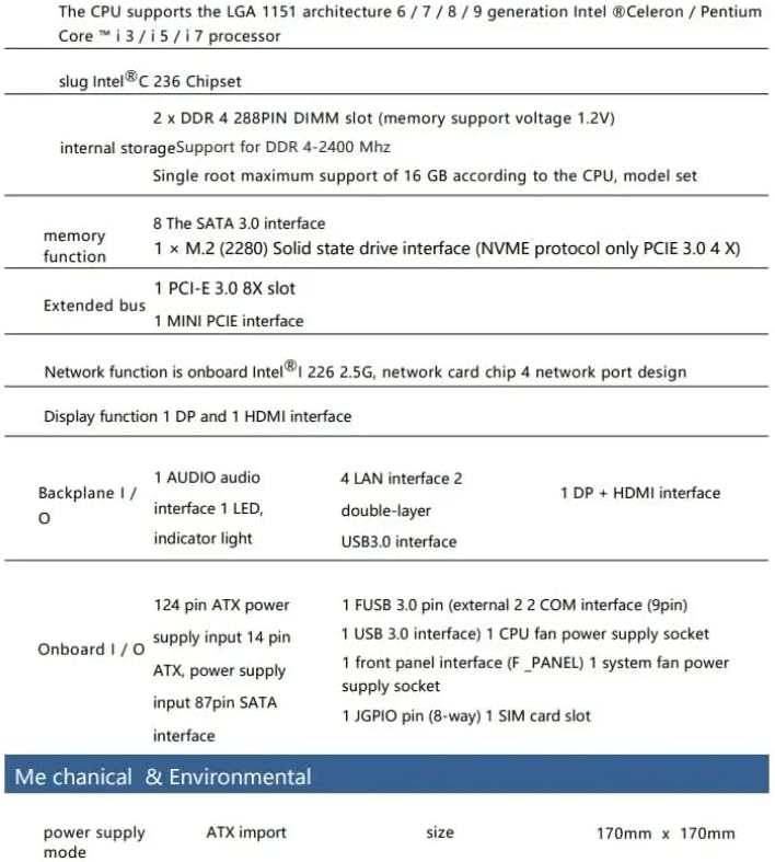 ―The CPU supports the LGA 1151 architecture 6 / 7 / 8 / 9 generation Intel Celeron / Pentium Core TM i 3 /i 5 /i7 processor -slug Intel C 236 Chipset -2 × DDR 4 288PIN DIMM slot (memory support voltage 1.2V), internal storageSupport for DDR 4-2400 Mhz,Single root maximum support of 16 GB according to the CPU. -Memory function:8 The SATA 3.0 interface;1 × M.2 (2280) Solid state drive interface (NVME protocol only PCIE 3.0 4 X) -Extended bus:1 PCI-E 3.0 8X slot;1 MINI PCIE interface. -Network function is onboard Intel i226 2.5G, network card chip 4 network port design. -Display function: 1 DP and 1 HDMI interface Backplane I/O:1×AUDIO audio interface;1×LED indicator;4×LAN interface;2×Dual-layer USB3.0 interface;1×DP+HDMI interface. Onboard I/O:1×24 pin ATX power input;1×4 pin ATX power input;8×7pin SATA interface;1×FUSB3.0 pin (can connect 2 external USB3.0 interfaces) ;1×Front panel interface (F_PANEL);1×JGPIO pin (8-way);2×COM interface (9pin);1×CPU fan power socket;1×System fan power socket;1×SIM card slot. Power supply: ATX input Dimensions: 170mm x 170mm Working temperature: -20~55℃ Ambient humidity: 5~90%RH relative humidity, no condensation