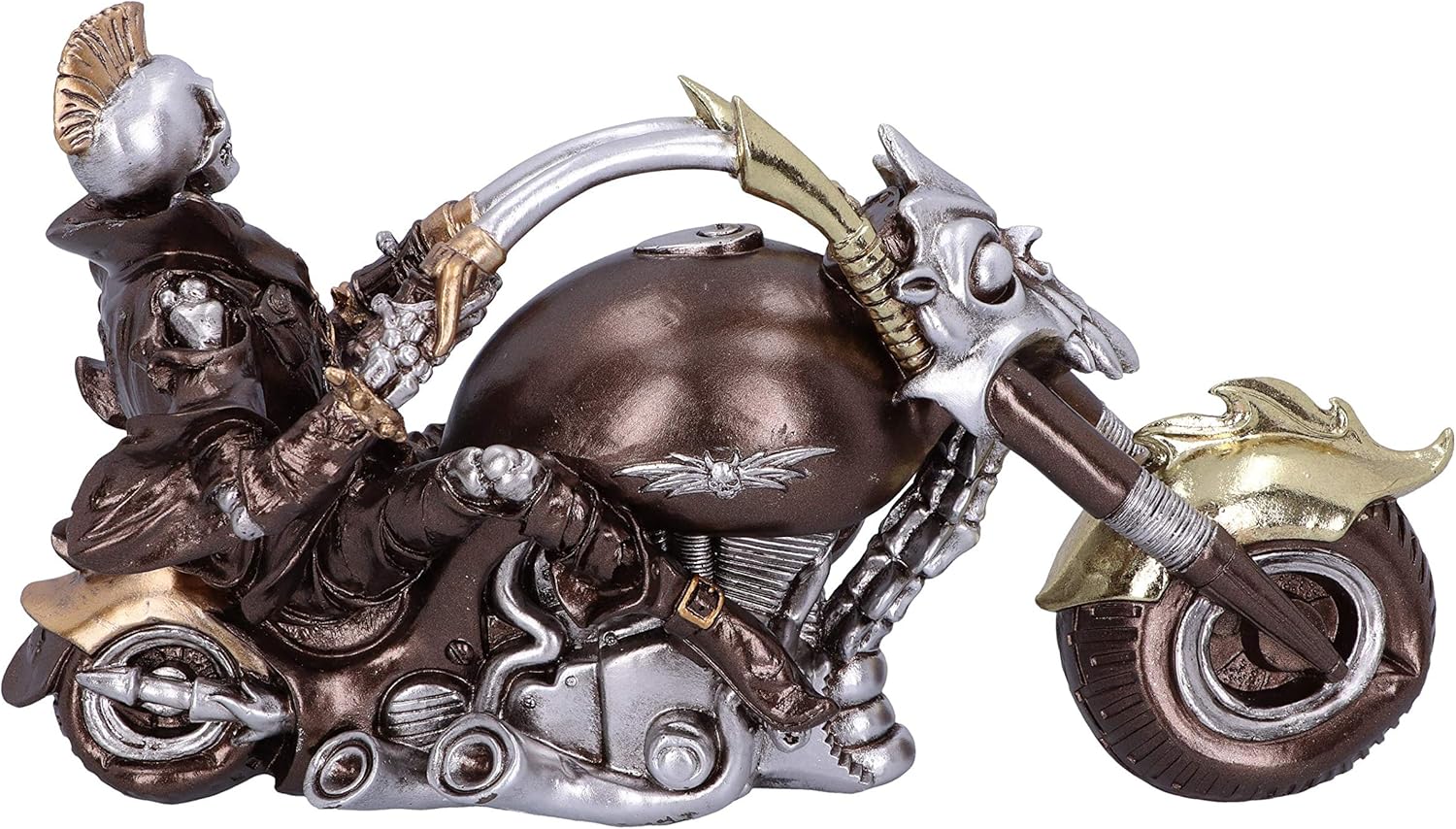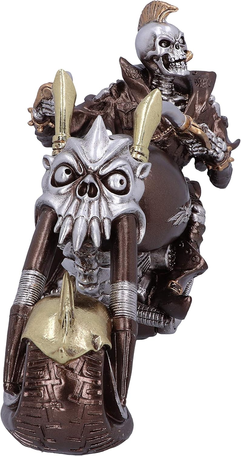 From steampunk masters Nemesis Now, this biker is ready to ride hell for leather! Built from steel and terror, this large cruising bike is fronted by a menacing fanged skull. A bulbous chassis with winged skull decoration for the base for the long curved handles. Straddling the bike, arms folded, a skeleton with a coppered mohawk wears a black leather biker jacket and torn jeans in true rebel fashion, complete with a cigar hanging from his jaw. Cast in high-quality resin before being painstakingly hand-painted, this is a perfect gift for any rebel reaper who’s ready to ride.