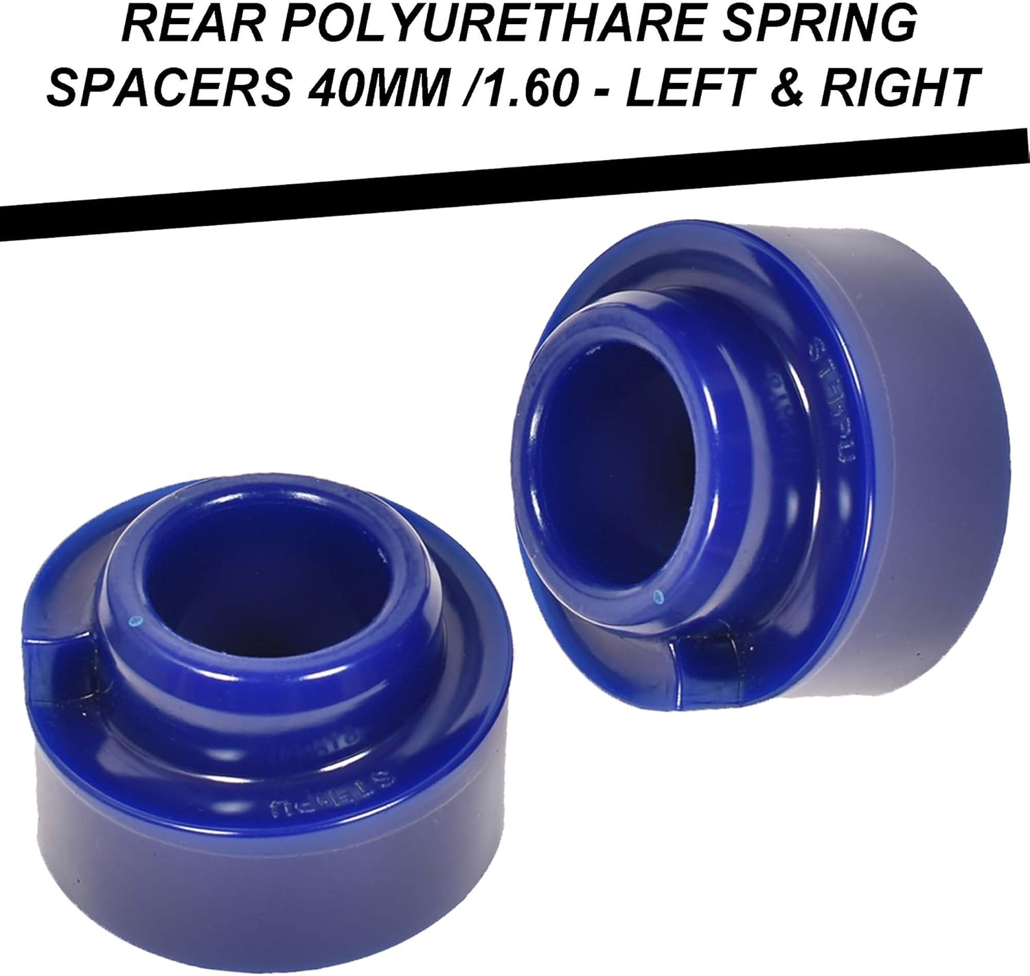 | Included Components | 2 pcs x Front Polyurethane Strut Spacers 40mm / 1.6" - Left & Right, 2 pcs x Rear Polyurethane Spring Spacers 40mm / 1.6" - Left & Right, 6 pcs x Longer Strut Bolts - Left & Right, KIT INCLUDES: 10 Pieces |