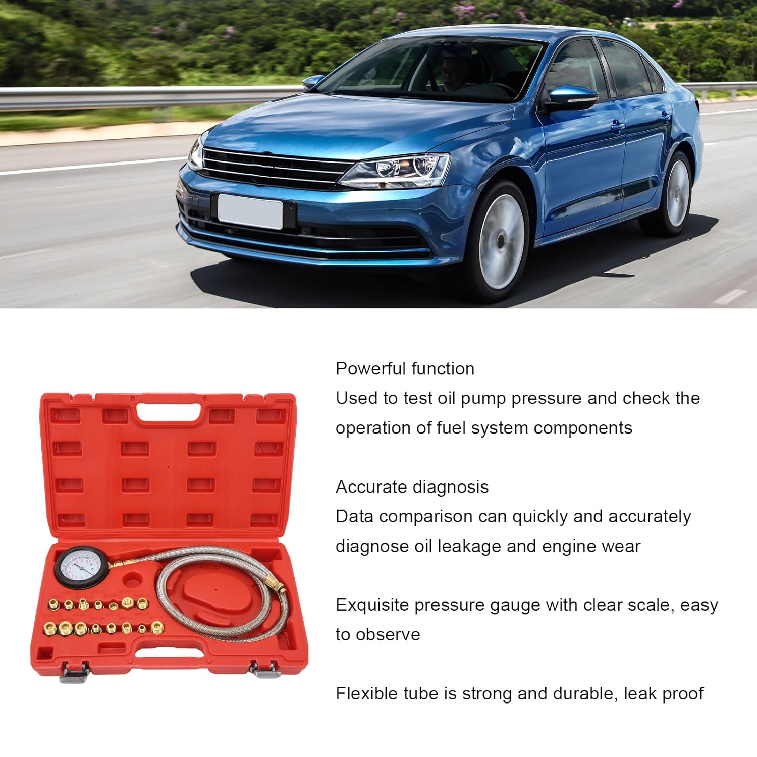 Specification:Item Type: Oil Pressure Test ToolMaterial: ABS, Rubber, BrassGauge Scale: 0-150psi / 0-1000KPaAdapter Size:M10x1.0, M10x1.25, M12x1.25, M12x1.5, M12x1.75, M14x1.25, M14x1.5, M16x1.25, M16x1.5, M18x1.5, NPT1/4, NPT1/8, NPT3/8, 1/2-20, 3/8-20Application: Suitable for almost all types of vehiclesPackage List:1 x Oil Pressure Test Tool(20PCS)1 x Storage Box
