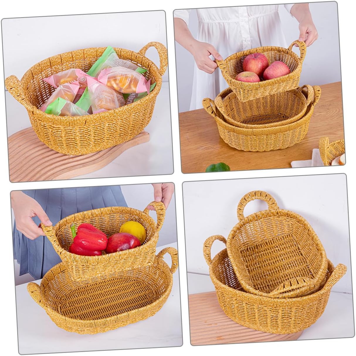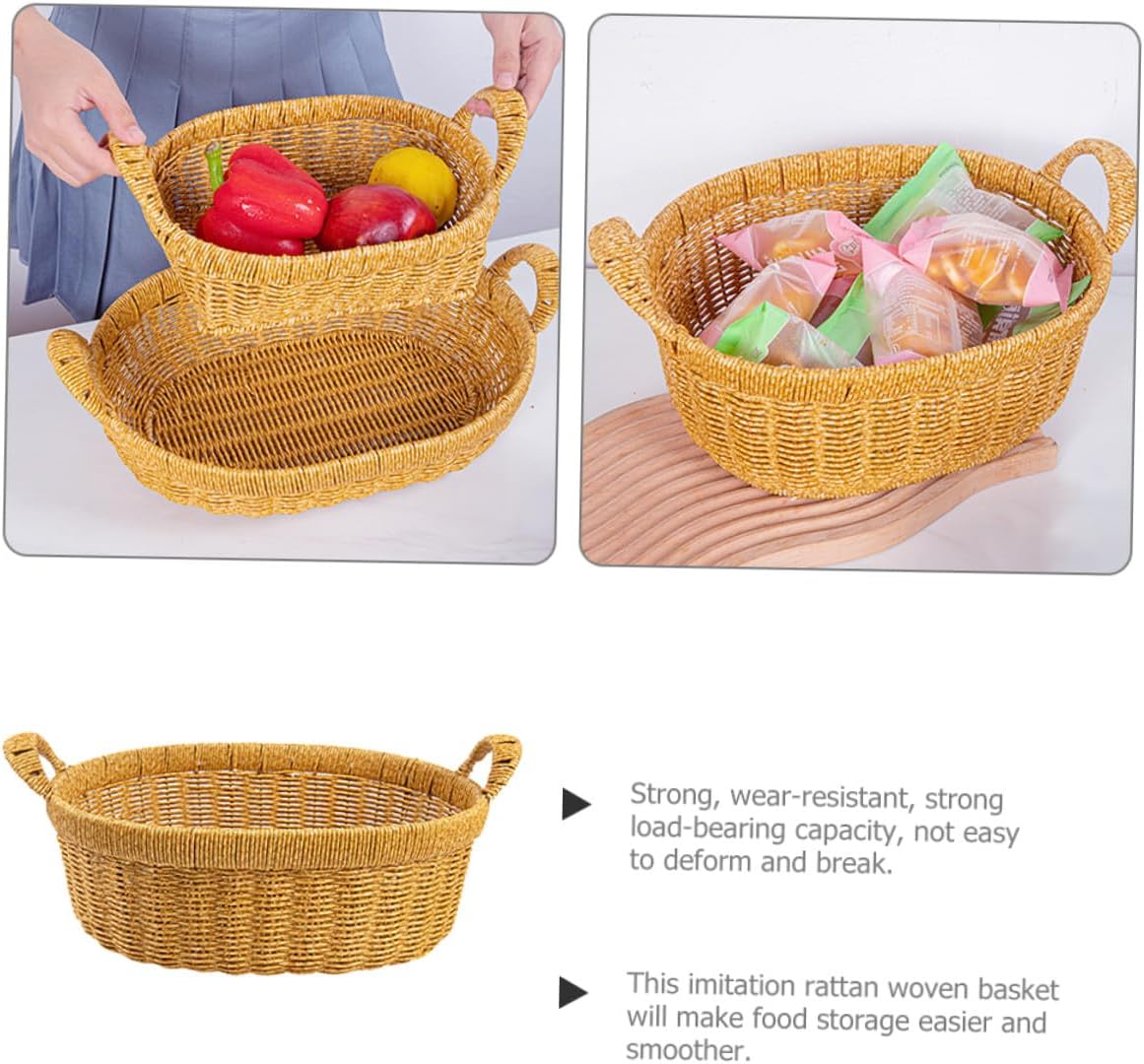 Package List 1 x basket Characteristics -Product Info:Fruit plate bread basket -Color:Khaki -Material:PP -Size:35.00X30.00X18.00cm/13.76X11.79X7.07in - Large capacity can be used to store snacks, fruits, bread, and other items imitation rattan storage basket. - Double handles basket design is convenient for carrying and can hold heavy objects imitation rattan dessert rack. - Strong, wear-resistant, strong load-bearing capacity, not easy to deform and break pantry baskets. - Simulated rattan weaving appearance is smooth, easy to clean, and tray. - Japanese style design is and beautiful, suitable for various occasions imitation rattan woven bread baskets.Goods Descriptionwoven storage basket Features the PP material, which has high durability, not easy to deform.household food holder Fine workmanship, practicality.pantry baskets This imitation rattan woven basket is solid and sturdy, which can withstand use.tray This imitation rattan woven basket will make food storage easier and smoother