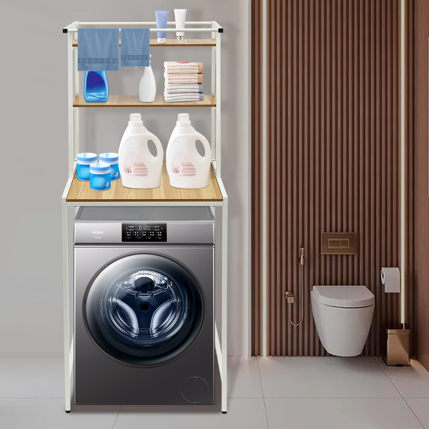 DescriptionThe washer and dryer storage rack with a three-tier design in white+log/black+oak/white colors combines practicality and simplicity. It has ample storage space, which can store all kinds of bathroom essentials and make your bathroom space clean and orderly. The modern and stylish design will elevate the look of your bathroom while providing a functional storage solution. It is a standout choice for anyone looking to upgrade his bathroom essentials.DetailsAdjustable Rubber Feet: They adapt to uneven floors, and prevent the floor from being scratched or abraded while keeping the rack stable and preventing it from wobbling and slipping.Protective Covers: They effectively prevent the cutting surface of the iron frame from scratching skin, thus enhancing safety during use and installation.ApplicationIt is suitable for bathrooms, laundry rooms, balconies, porches, living rooms, etc. as a refrigerator rack, kitchen rack, plant rack, storage rack, laundry rack, washing machine rack, and so on.SpecificationsMaterial: MDF, Iron, RubberSurface Treatment: Spraying, Veneering TechnologyColor: White+Log/Black+Oak/White+MarbleStyle: ModernShape: RectangularMount Type: Floor MountRoom Type: BathroomShelf Type: Tiered ShelfNumber of Tiers: 3Single-tier Load-bearing Capacity: 10kg/22lbsAdjustable Feet Height: About 1cm/0.39inGross Weight: 11.2kg/24.69lbsFirst-tier Height: 10cm/4inSecond-tier Height: 30cm/11.81inThird-tier Height: 35cm/13.78inBottom Compartment Size: 65*60*97cm/25.6*23.62*38.18inTop Width: 46cm/18.11inProduct Size: 69*60*176.5cm/27.16*23.62*69.48inPackage Size: 103*64.5*7.5cm/40.55*25.39*2.95inPackage Included1* Washer and Dryer Storage Rack1* Chinese and English Installation DiagramAll Accessories for Installation