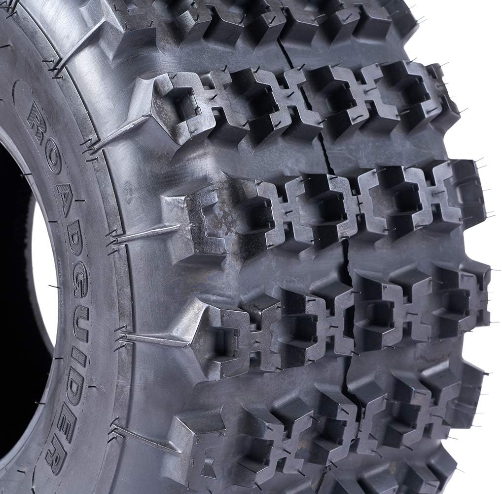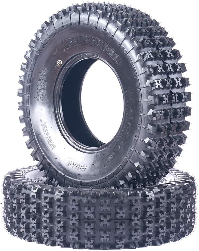 The Roadguider MIDAS have Directional "X" angled knobby tread design great in most terrain with high performance on trails. Features premium rubber in our hard compound to withstand the harshest racing conditions. A perfect replacement tire for your quad ATV, UTV, Go Kart, Golf Cart or Lawn Mower. * Tire Size: 23x7-10 * Tire QTY: 2 * Rim Size: 10 x 5.5 * Ply Rating: 6 * Tire Diameter: 23 * Tread Depth: 16 * Max Load: 275 (125kg) * Max PSI: 7 * Tire Weight: 38