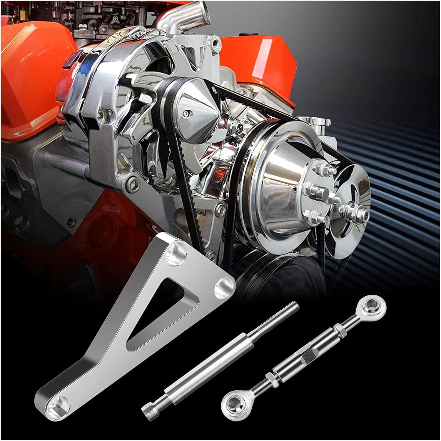 Upgrade your Ch ev y Small Block 350 engine with this complete alternator bracket kit, designed for a precise fit and reliable performance. The bracket is constructed from aluminum with a polished chrome finish, offering a sleek look and lasting surface endurance. It includes an integrated swivel tensioner to help maintain proper belt tension for consistent operation. This set is mounted on the passenger side and uses the pump for the lower bracket attachment, ensuring a straightforward installation process.Specification:Item Type: Alternator Bracket KitMaterial: AluminumOEM: PCE232.1002Alternator Mounting Location: Passenger sideGenerator Bracket Type: Upper and Lower BracketLower Bracket Mounting Type: PumpFitment: Replacement for Ch ev y small block engine 350Package List:1 x Alternator Bracket10 x Accessory