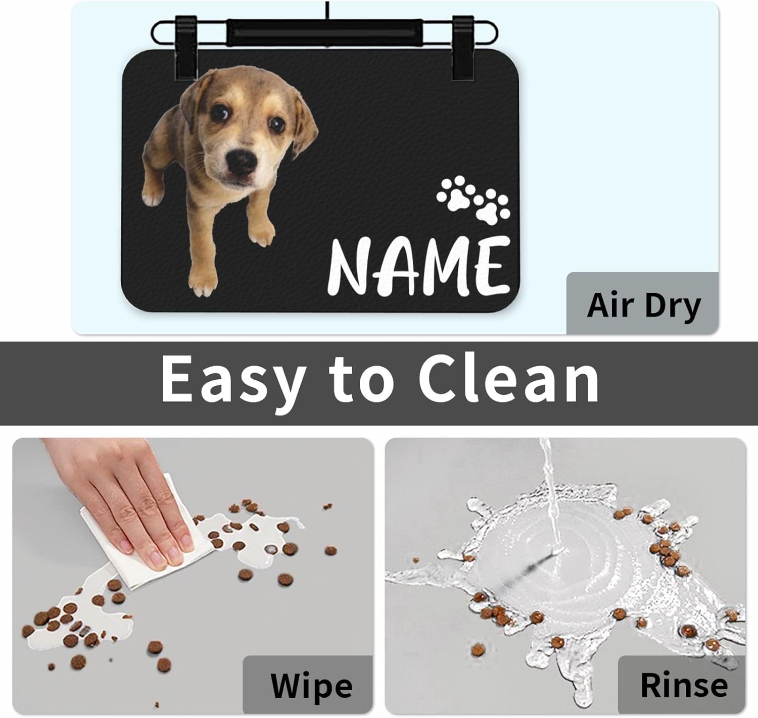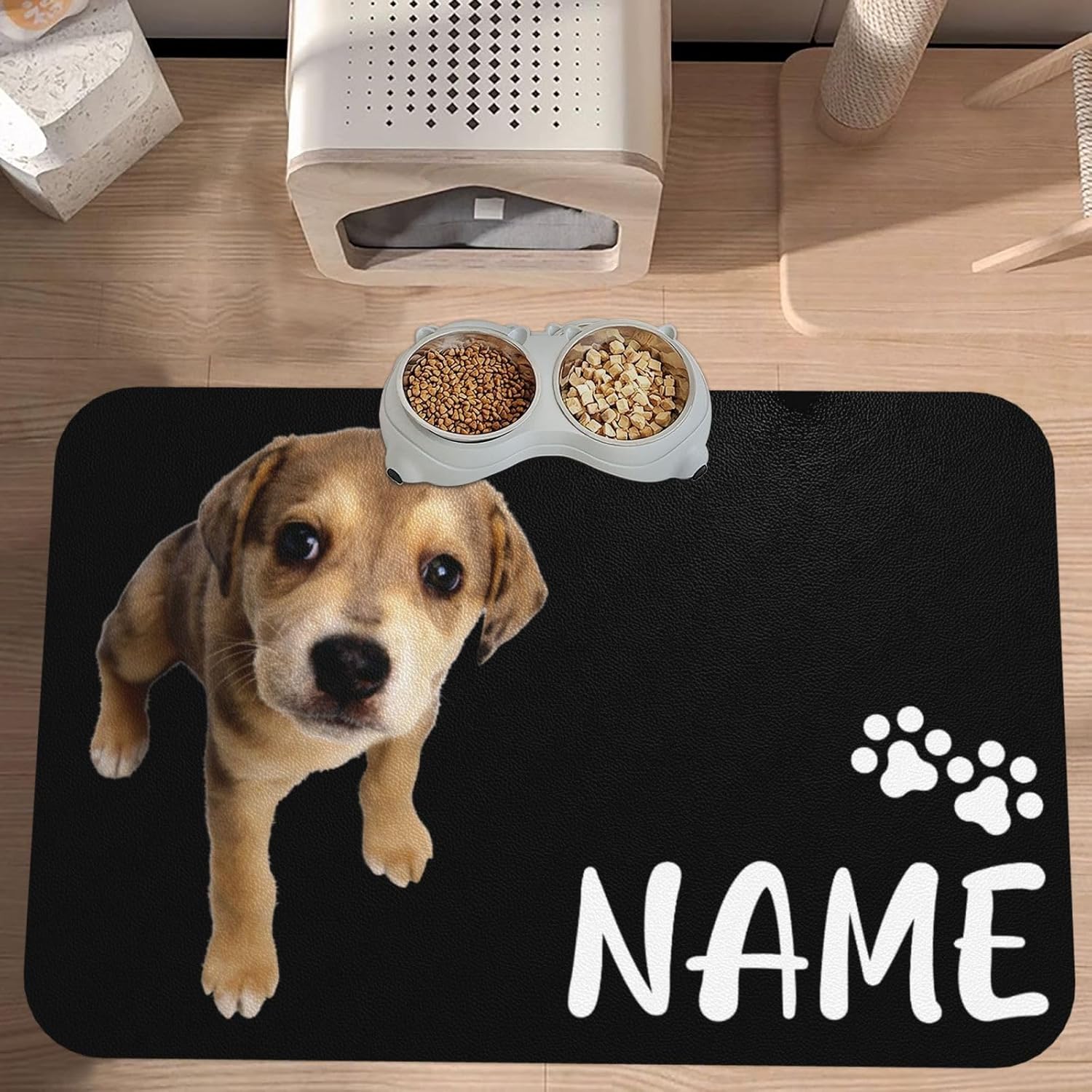 Use our pet food mats to provide a clean and stylish dining space for your cute pets!Product Features:1. The cushion is made of PU leather material and rubber bottom;2. Has fast water absorption and drying ability, keeping the feeding environment clean;3. Anti slip bottom, will not shift during use;4. Not easily stained with pet hair or food residue;5. Easy to clean, can be directly cleaned or wiped with water;6. After use, it can be rolled up directly to save space and facilitate carrying when going out.Designed for Real Life:→ For Busy Owners: Save more time on cleanup;→ For Health-Conscious Pets: Dry surface can protect pet paws;→ For Style Lovers: Classic prints complement home décor – available in multiple patterns.Perfect For:✓ Multi-pet households ✓ Small-space apartments ✓ Travel & outdoor adventures ✓ Elderly pets needing stabilitySupport Customization:If you want to get a more unique pet feeding mat, you can click the "Customize Now" button to customize a personalized mat for your pet.Customization Steps:1. Select the desired size and click the "Customize Now" button;2. Choose your favorite cushion style;3. Upload photos of pets or other favorite pictures;4. Enter the name or other text of the pet;5. Adjust images and text to the appropriate size and dimensions;6. Add to cart to get a unique pet feeding mat.