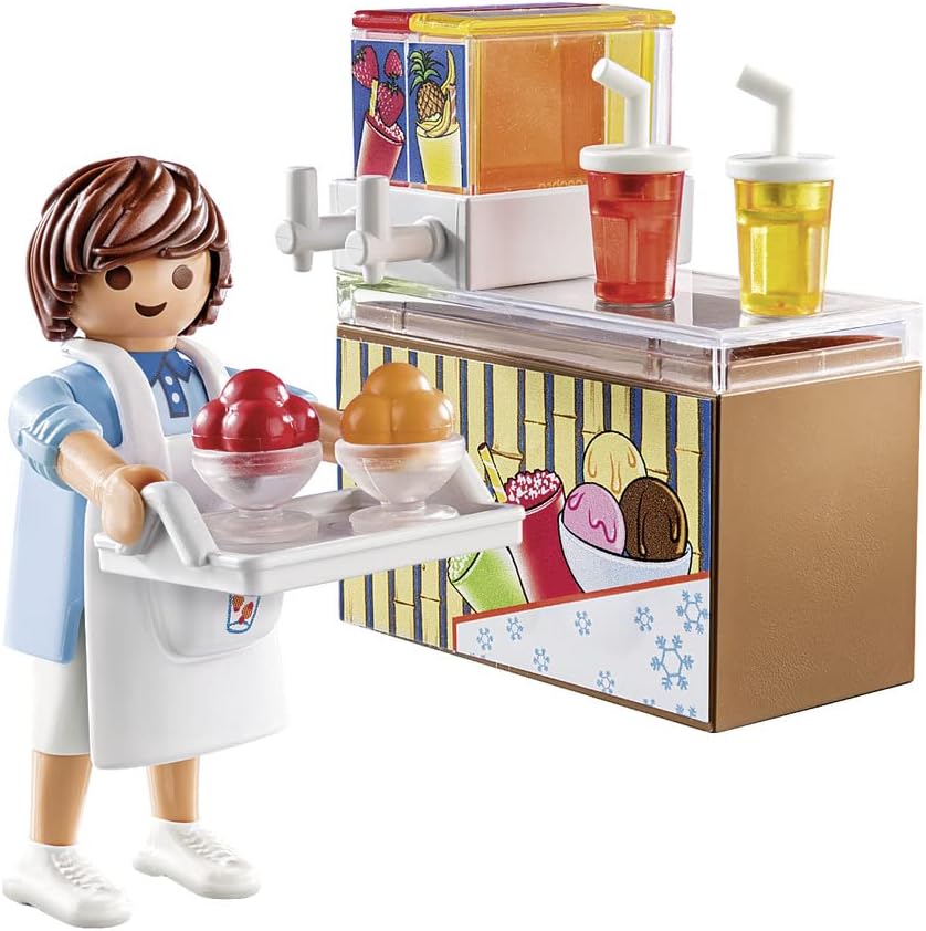 The Street Vendor sells slushies and ice cream. The set includes a tray for serving multiple items, and the vendor wears a removable apron. The set is complete with a counter.