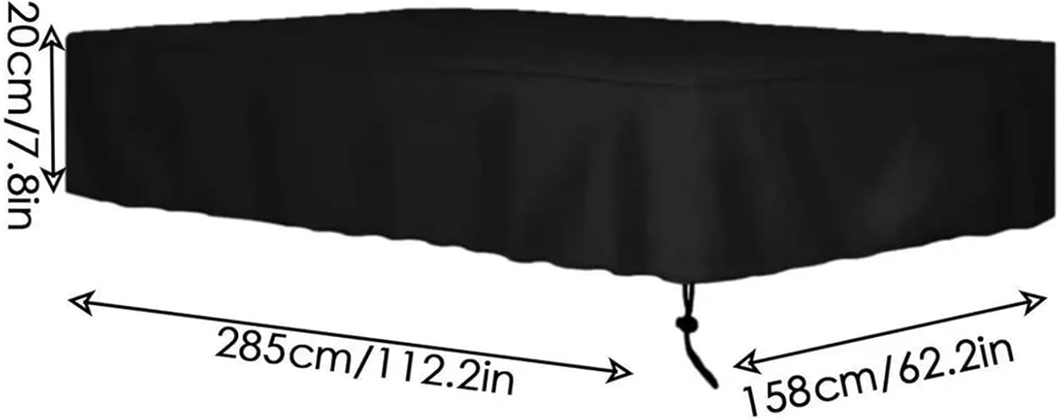 General Installation and Care Tip: Before covering, ensure the table surface is clean and dry. Drape evenly, allowing the weighted corners to settle naturally. Clean spills immediately with a damp cloth; for deeper cleaning, wipe with mild soap solution and air dry. Fold loosely for storage, avoiding sharp creases that could stress the material over time.7FT: 235x135x20cm/92.52x53.15x7.87 inches; 350g8FT: 245x140x20cm/96.46x55.12x7.87 inches; 360g9FT: 285x158x20cm/112.2x62.2x7.87 inches; 450gPool Table Cover*1Note:1. The real color of the item may be slightly different from the pictures shown on website caused by many factors such as brightness of your monitor and light brightness.2. Please allow slight manual measurement deviation for the data.