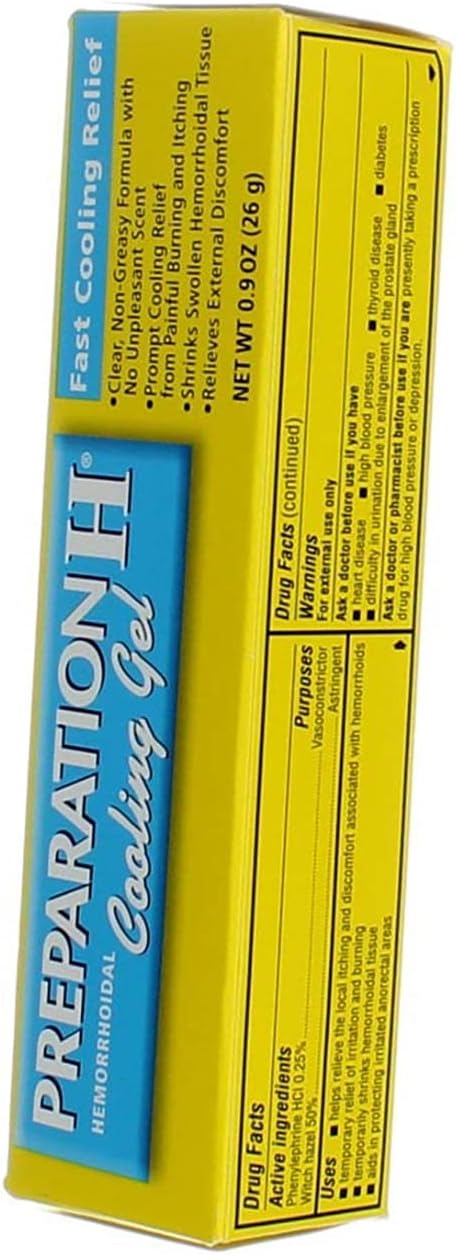 - Includes one tube per box of Preparation H Cooling Gel for relief from hemorrhoid symptoms -Among over the counter hemorrhoid relief products, Preparation H is the #1 selling brand. (1) When hemorrhoids flare up and disrupt your day, trust Preparation H Cooling Gel for fast, cooling relief. There are several symptoms of hemorrhoids that can disrupt your day including painful burning, anus itching and swelling. Preparation H Cooling Gel contains vitamin E and aloe for soothing, cool relief of external hemorrhoid symptoms. Unlike some other hemorrhoid treatment gels and creams, Preparation H gel is clear, non-greasy, non- staining and has no unpleasant odor. At the first sign of hemorrhoid discomfort, treat with Preparation H Hemorrhoidal Cooling Gel. In fact, treating signs of hemorrhoid symptoms early can help prevent further irritation.