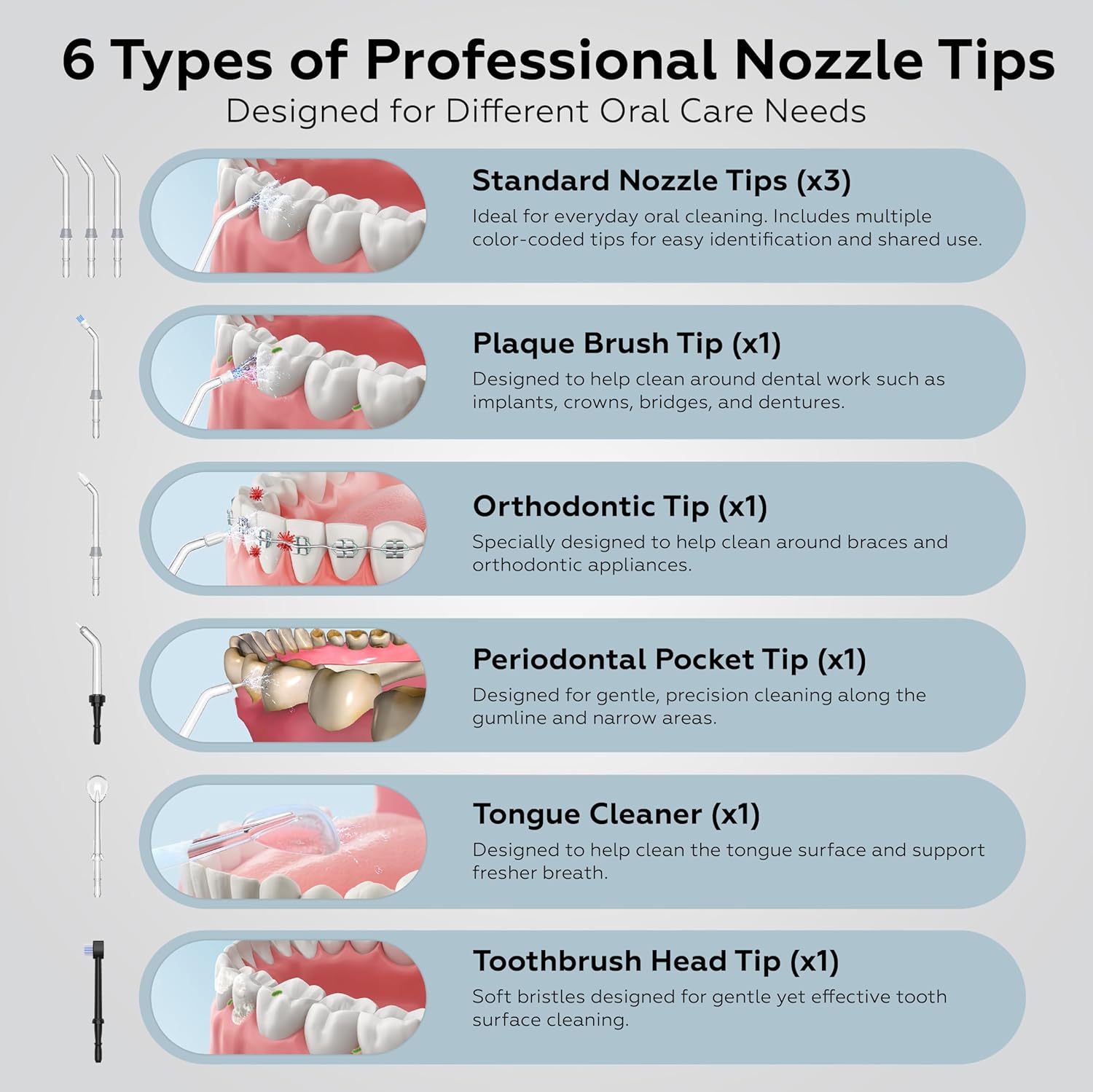 | Product Benefits | Designed for convenient, effective at-home oral care, Enhances cleaning around braces, implants, and dental work, Helps remove food debris and plaque from hard-to-reach areas, Improves daily oral hygiene beyond brushing alone, Provides customizable cleaning for sensitive to deep-clean needs, Supports cleaner teeth and healthier-looking gums |