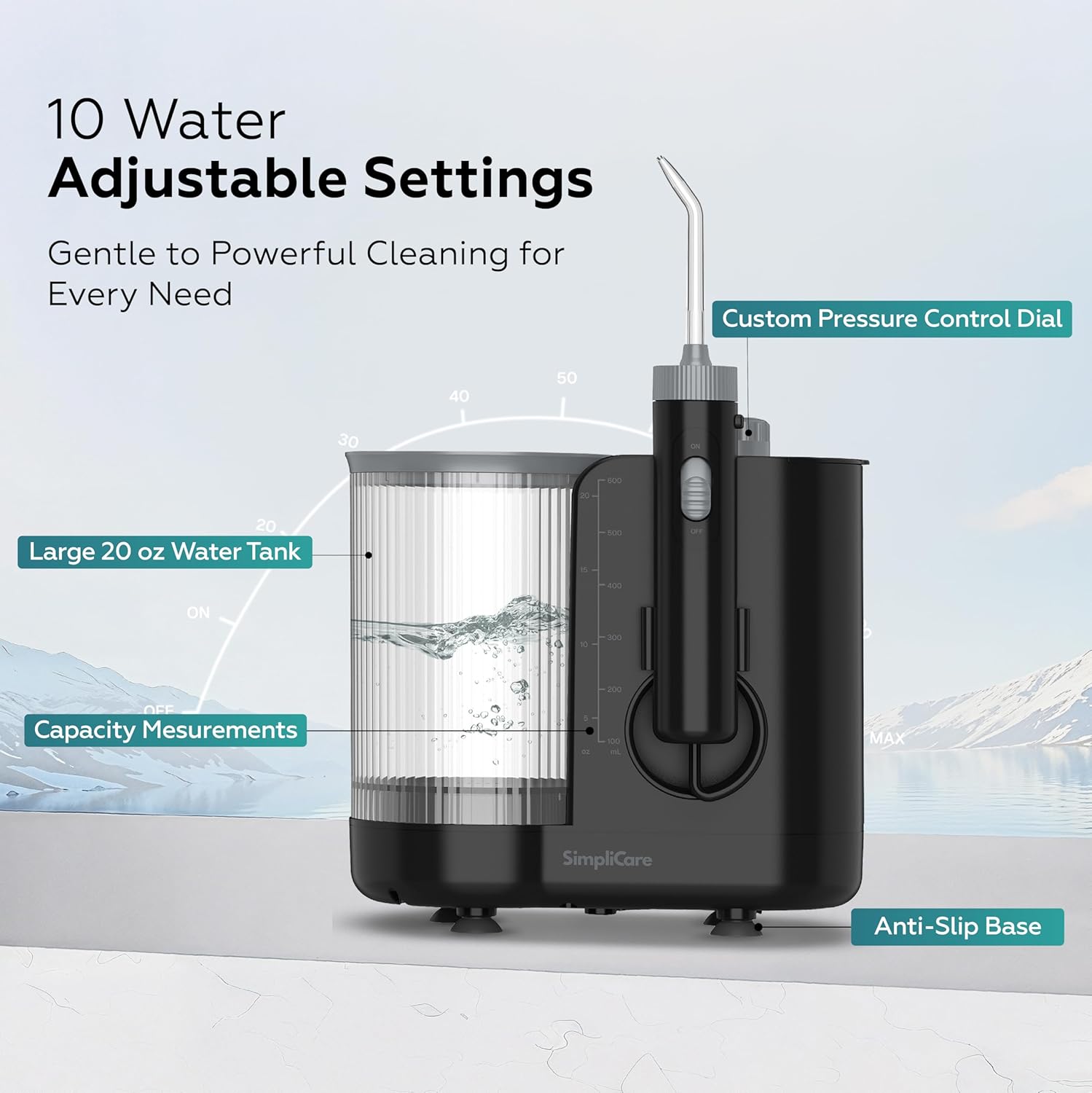 Upgrade your daily oral care routine with the SimpliCare FC1761 Countertop Water Dental Flosser, designed to deliver powerful, customizable cleaning from the comfort of your home. Featuring a wide 21–160 PSI pressure range and 10 adjustable pressure levels, this oral irrigator allows you to choose gentle cleaning for sensitive gums or deeper cleaning for plaque-prone areas, braces, implants, and gum pockets. The large 20.3 fl oz (600 mL) water tank supports uninterrupted full-mouth cleaning without frequent refills, making it ideal for family use and countertop setups. Powered by an advanced piston pump system, the FC1761 delivers 1450 high-frequency pulses per minute, helping flush away food debris and plaque from hard-to-reach areas between teeth and along the gumline. Complete 8-Tip System for Total Oral Care Includes 8 interchangeable tips for versatile daily cleaning: 3 Standard Jet Nozzles for everyday use, 1 Orthodontic Tip for cleaning around braces and orthodontic appliances, 1 Precision Gum Care Tip for targeted cleaning along the gumline and narrow areas, 1 Plaque Brush Tip for cleaning around implants, crowns, bridges, and other dental work, 1 Tongue Cleaner Tip to help freshen breath, and 1 Toothbrush Head Tip with soft bristles for combined brushing and water flushing. All tips attach securely to the main unit (no internal battery). All tips attach directly to the main unit and do not require batteries or charging. Built with BPA-free materials, IPX4 splash resistance, and quiet operation (≤75 dB), the SimpliCare FC1761 is designed for safe, convenient home use. It offers a reliable and effective solution for maintaining a cleaner, healthier mouth every day. Plug-and-Play Convenience: No charging required — simply plug it in with the included American standard adapter and begin flossing.