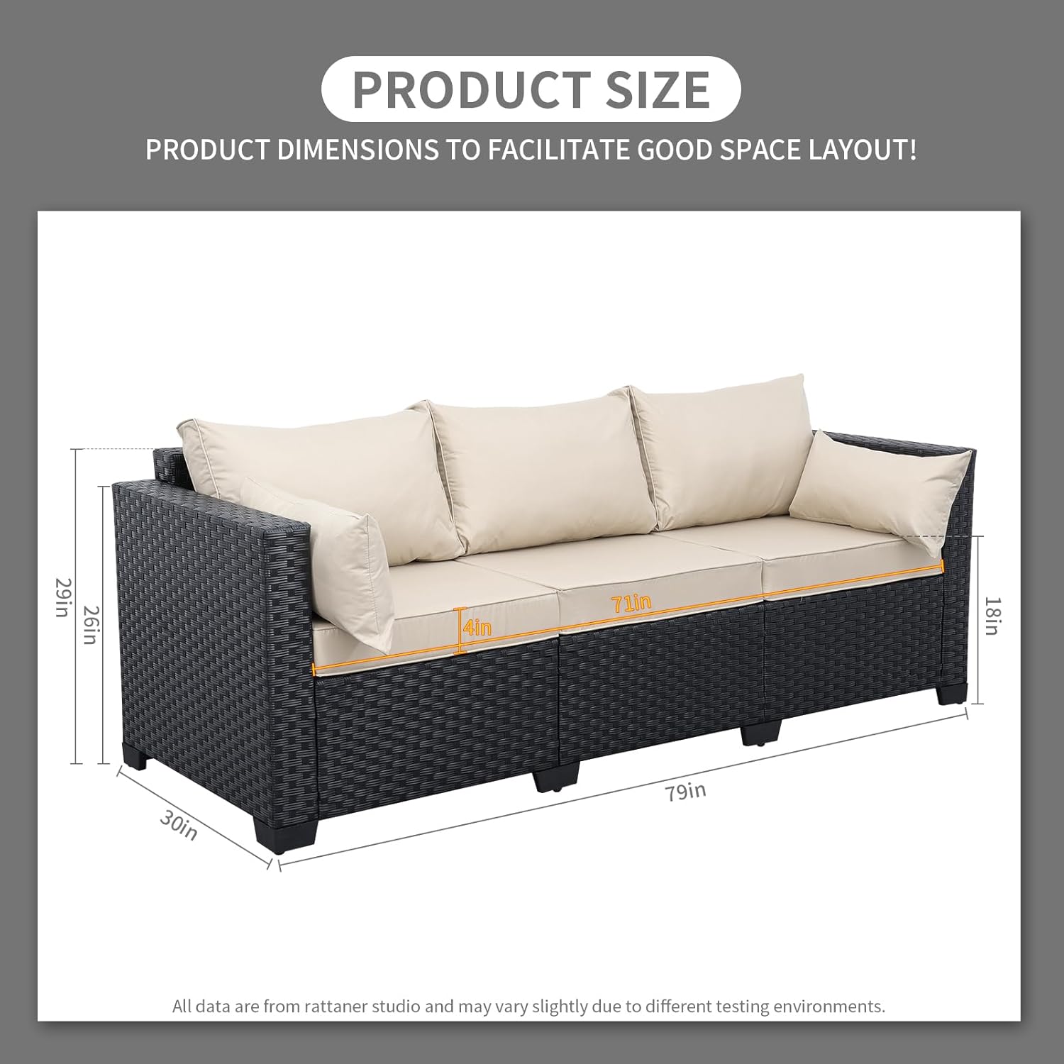 Feature:Graceful, breezy style that doesn't compromise on comfort and durability. That's what defines this patio furniture outdoor sofa. The expertly finished synthetic wicker and skillful design elevate the look of any outdoor space. Create your classic outdoor oasis with it.Specification:Material: steel frame, high-density polyethylene(HDPE) wicker, high resilience sponge, 250g polyester fabricFrame Color: black wicker, khaki cushionsChair Design: deep seatingDimensions(L*W*H/(in)):- total size: 79*30*29- seat width: 71- seat depth: 26- seat height: 18- seat cushion: 26*24*4- back cushion: 24*24More details reference picture.Set Include:1 Box- outdoor sofaOther items included in the box- 3 seat cushions- 3 back cushions- 1 waterproof cover- instructions and all necessary hardwareNotice:- Compressed Package: The 3 pcs seat cushion inserts are vacuum packed 2 bags, allow a few days for them to expand to the final size listed in the description.- Assembly Required: Advisable to assemble on the mat to wear and tear, do not tighten all screws entirely until assembly is complete.- Care & Maintenance: To extend its service life, extra protection will need in some extreme weather conditions as well as simple daily care.