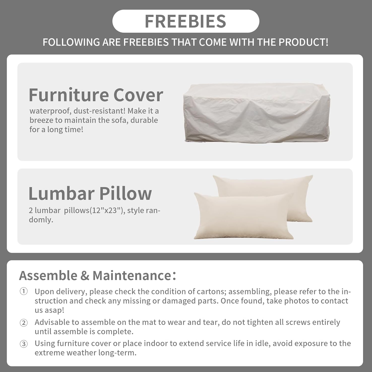 | Assembly Instructions Description | The patio couch comes with clear instructions and all necessary hardware for smooth assembly. An Assembly Demo Video is also available. |
