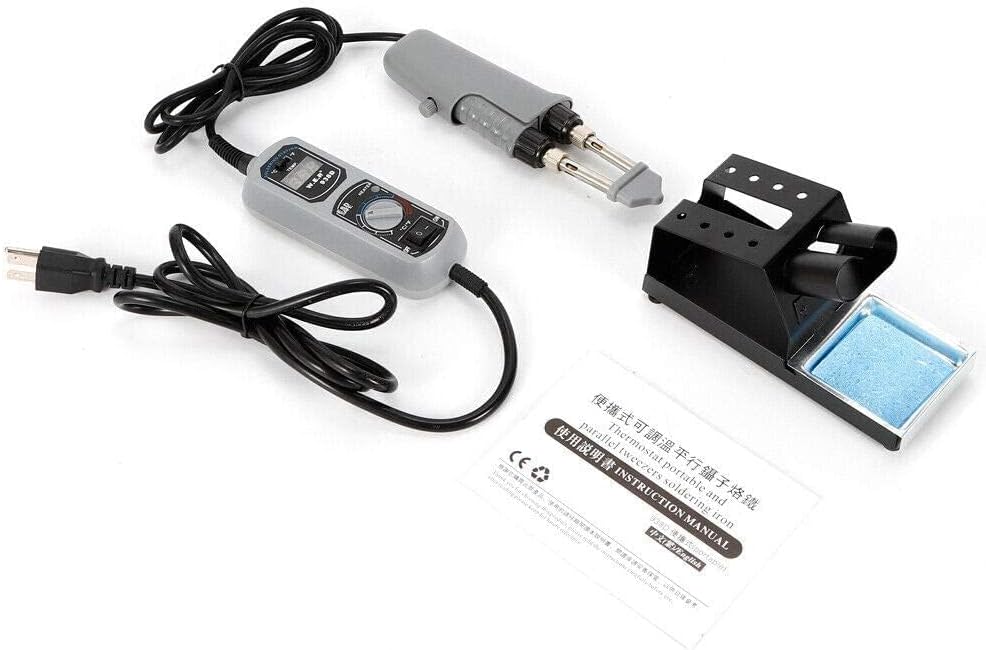 Features:High-power heater, tweezers parallel design. When need to remove the electronic components, you can use the parallel tweezers to heating the components and weld joints. It is easily and quickly to removed element without prejudice to the case of peripheral devices. It is used for different weld joints de-soldering ,more suitable for large joints, especially for factory batch job, one time can weld two points, it's high efficiency.Parallel electric tweezers design, very convenient for small electronic components,chip, chip removal and installation of welded components. When you need to remove the parallel electric tweezers can be used directly on the welding points across the resistor components for heating.Specifications:Model: 938DVoltage: AC 110V±10% 60HzPower: 120WTemperature Range: 200~480°CStability of temperature: ±2°C(static state)Work temperature: 0~40°CStorage temperature: -20°C~80°CStorage humidity: 35%~45%Tip of ground Resistance: <2ΩTip of ground Voltage: <2mVTemperature display: LED digital displayCelsius/Fahrenheit Display Temperature conversion mode10 minutes fixed sleep modePackage included:1 × Portable Hot Tweezers Mini Soldering Station(US PLUG)1 x Stand