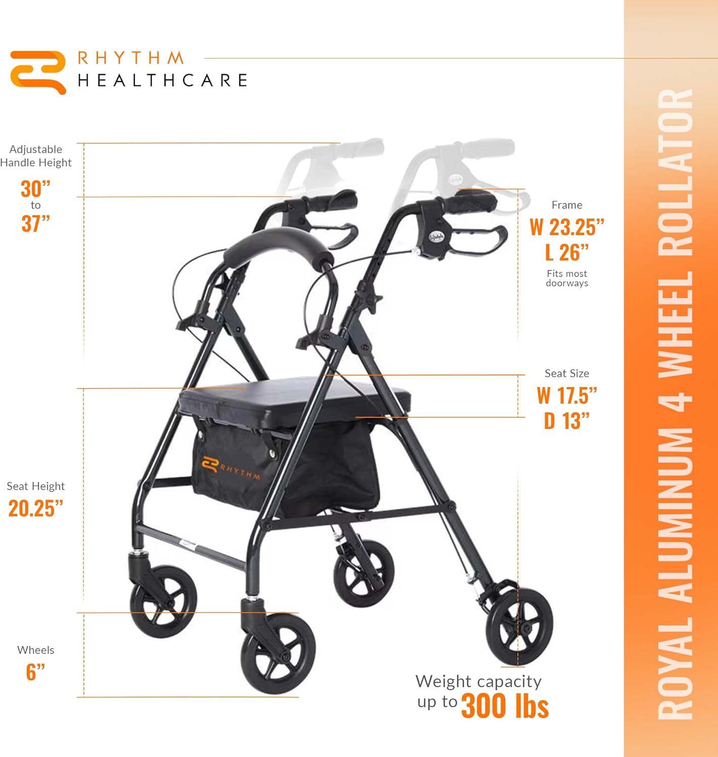 The Rhythm Healthcare Royal Aluminum 4 Wheel Rollator brings a blend of comfort, support, and convenience to daily mobility needs. Designed for adults seeking reliable walking assistance, this rollator is lightweight yet durable, making it easy to maneuver while providing dependable stability. Its sleek frame and smooth rolling wheels allow for confident use whether indoors or outdoors, giving users the freedom to move with greater independence. A padded seat creates a comfortable resting place whenever needed, while the included tote bag adds practical storage for personal items. Locking loop brakes give users and caregivers peace of mind with secure stopping power that is easy to control. This rollator is engineered for quick folding, simplifying transport and storage whether at home, in a vehicle, or during travel. Thoughtfully designed to meet diverse needs, the adjustable handle height and supportive seat dimensions make it versatile for a wide range of adults. Built to handle everyday use with confidence, it maintains a balanced combination of lightweight construction and high strength. With a generous 300-pound weight capacity, it ensures reliability while remaining easy to lift and handle. Rhythm Healthcare is dedicated to providing trusted solutions for mobility, crafted to bring independence and comfort to daily living. The Royal Aluminum 4 Wheel Rollator embodies this commitment by offering practical design features, dependable construction, and user-focused innovation for seniors and caregivers alike.