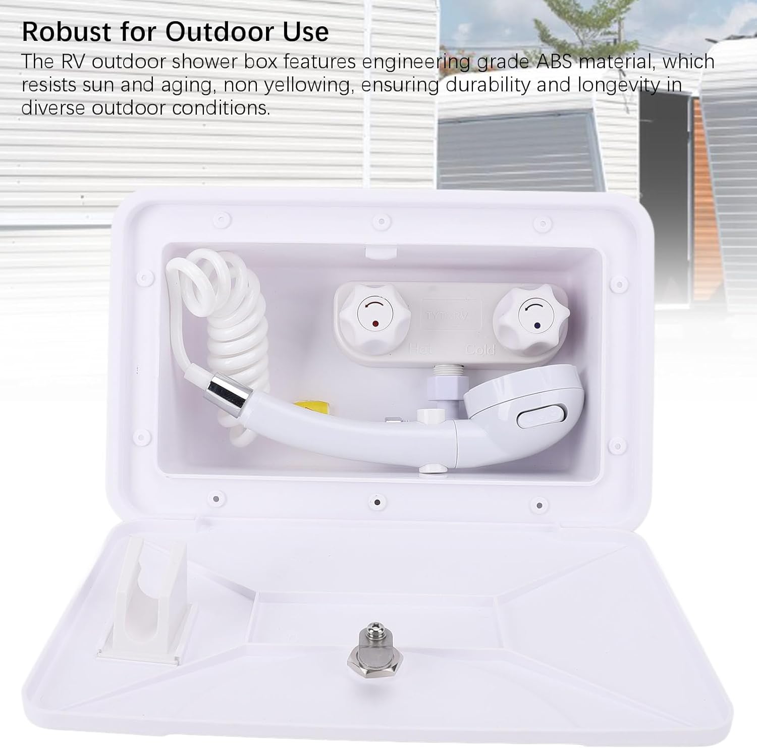 Item Type: RV Exterior Shower BoxMaterial: ABSInstallation Type: Recessed installation needs drillingOpening Size: Approx. 280 x 150mm / 11.02 x 5.91in Expansion Hose Length: Approx. 1.5m / 4.92ftFeatures: Cold and hot water independent switches, shower head independent switch, three modes of water output switching, 1.5m automatic retractable hose, with safety lock, cover plate with shower head hanger rackPackage List:1 x RV External Shower Box2 x Keys2 x Rubber Rings11 x Screws