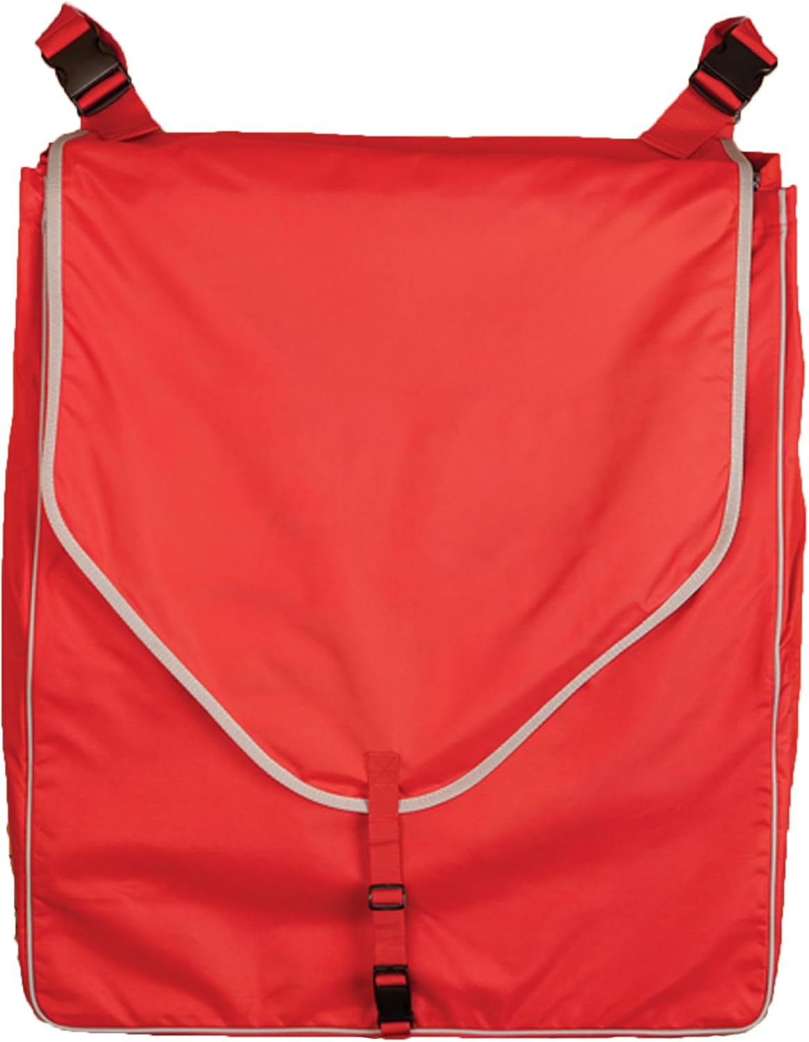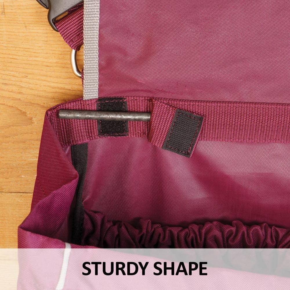 We've created the ultimate stall bag to meet all your needs! This bag not only extends the life of your items by keeping them clean but also helps maintain a tidy barn aisle. Made of durable 600 denier polyester with a Teflon coating, this bag can handle it all. A removable metal bar keeps the bag in shape, even during washing. Available in various styles, the bag includes a fold-over flap to keep dust and debris out, while a plastic buckle and adjustable webbing ensure a secure closure. The Teflon coating adds extra resistance to dust, stains, and oils.Supreme Stall Front Bags come in multiple sizes to organize all your horse's clothing and gear. Inner elastic pockets keep smaller items like wraps, boots, and brushes easily accessible. The large bag is ideal for storing bigger items such as turnout and stable blankets, coolers, and more, while the smaller bag is perfect for slickers and light sheets. Each bag features a clear plastic ID slot for labeling, ensuring easy identification for each horse and owner.The Small Bag Inner Pocket measures 9" L x 9" T, and the Large Bag Inner Pocket measures 12" L x 10" T. These bags are versatile, transitioning seamlessly from the barn to the trailer to the showgrounds, keeping your items organized wherever you go. The Large bag includes a removable, adjustable shoulder strap and two plastic buckles on adjustable 2" wide webbing for quick attachment to stall front bars. The Small bag also has a removable, adjustable carrying strap that doubles as an attachment around stall bars. Both bags are equipped with chrome-plated snaps for added durability.The Large stall front bag features a removable steel bar insert and a removable plexiglass bottom, ensuring it won't sag or lose shape, even when packed with heavy blankets. The Small stall front bag has a flexible stay enclosed in the material at the top to prevent sagging. Dimensions are 29 1/2" x 24 1/2" x 9".