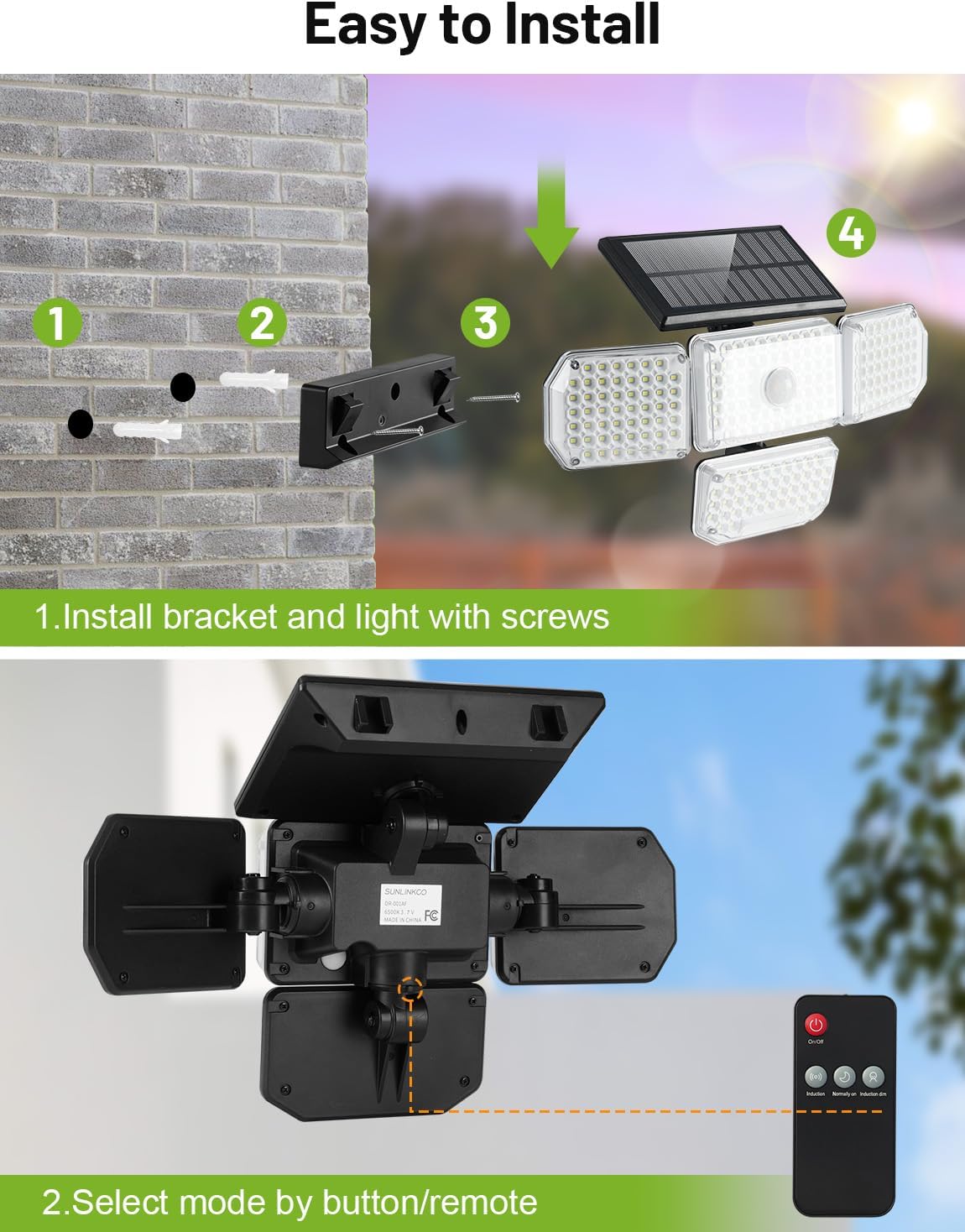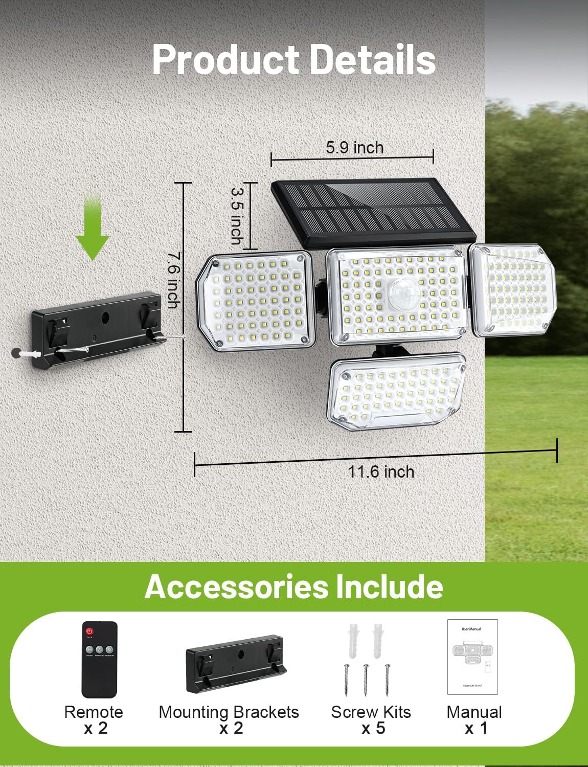 | Included Components | 2 x Four-Head Solar Lights, 2 x Mounting Brackets, 5 x Screw Kits, Instruction Manual, Remote Control |