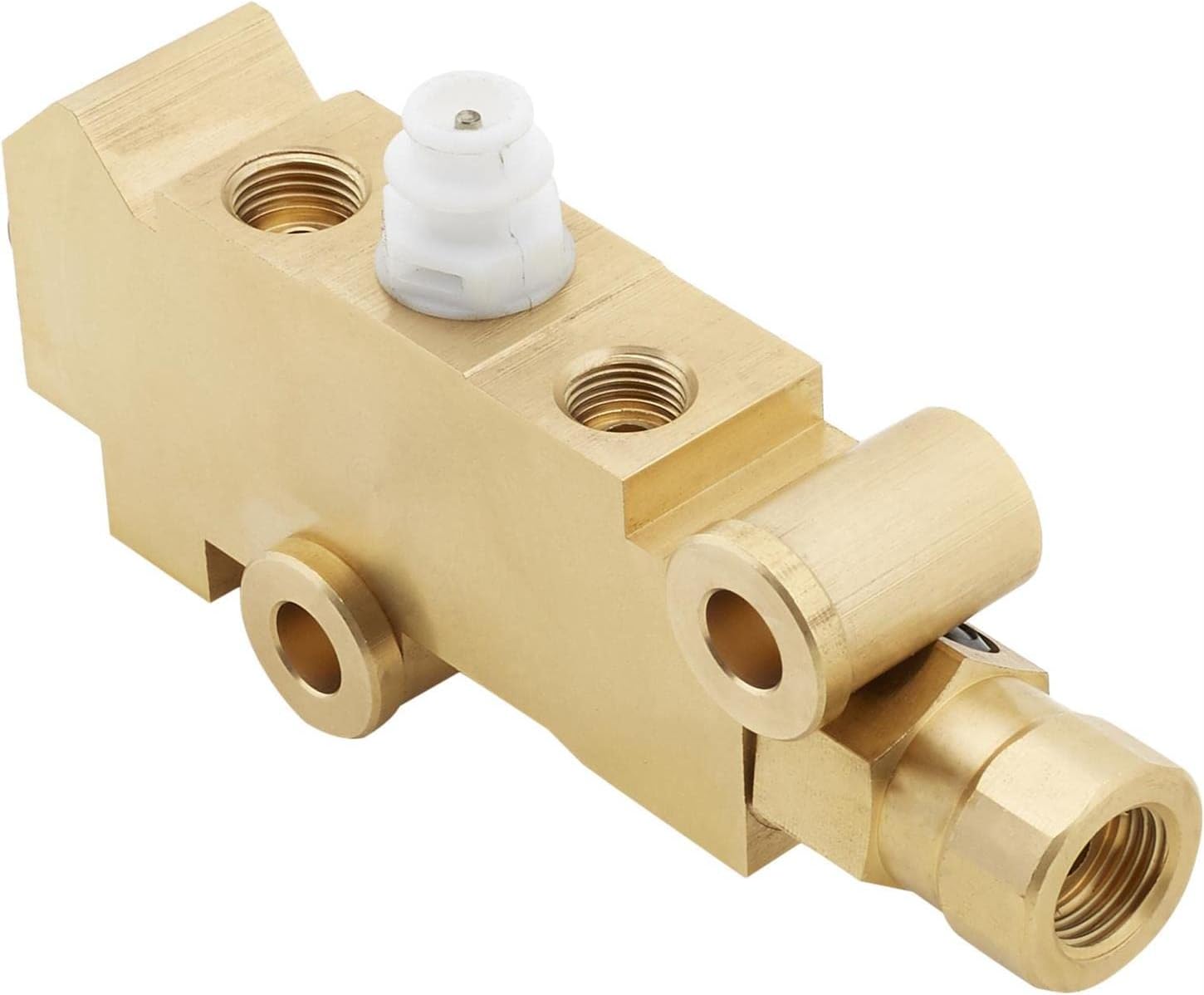 These proportioning valves are similar to what GM used on many cars in the 70s. They are non-adjustable and may require an adjustable valve in the rear brakes (if needed). Block incorporates metering (for front brakes) and proportioning (for rear brakes) into one unit. For use with front disc, rear drum brake systems. Includes hard lines to connect to a master cylinder with 1/2"-20 and 9/16"-18 outlets. Item Details For M/C with 1/2"-20 and 9/16"-18 outlets.Bottom Front Port: 3/8 "-24 IFF threads - goes to one front brake Top Front Port: 3/8 "-24 IFF threads - goes to one front brake Middle Top Port: 1/2 "-20 IFF threads - comes from master cylinder Rear Top Port: 7/16 "-24 IFF threads - comes from the master cylinder Rear Most Port: 9/16 "-18 IFF threads - goes to rear brakesBottom Front Port: 3/8 "-24 IFF threads - goes to one front brake Top Front Port: 3/8 "-24 IFF threads - goes to one front brake Middle Top Port: 1/2 "-20 IFF threads - comes from master cylinder Rear Top Port: 7/16 "-24 IFF threads - comes from the master cylinder Rear Most Port: 9/16 "-18 IFF threads - goes to rear brakes