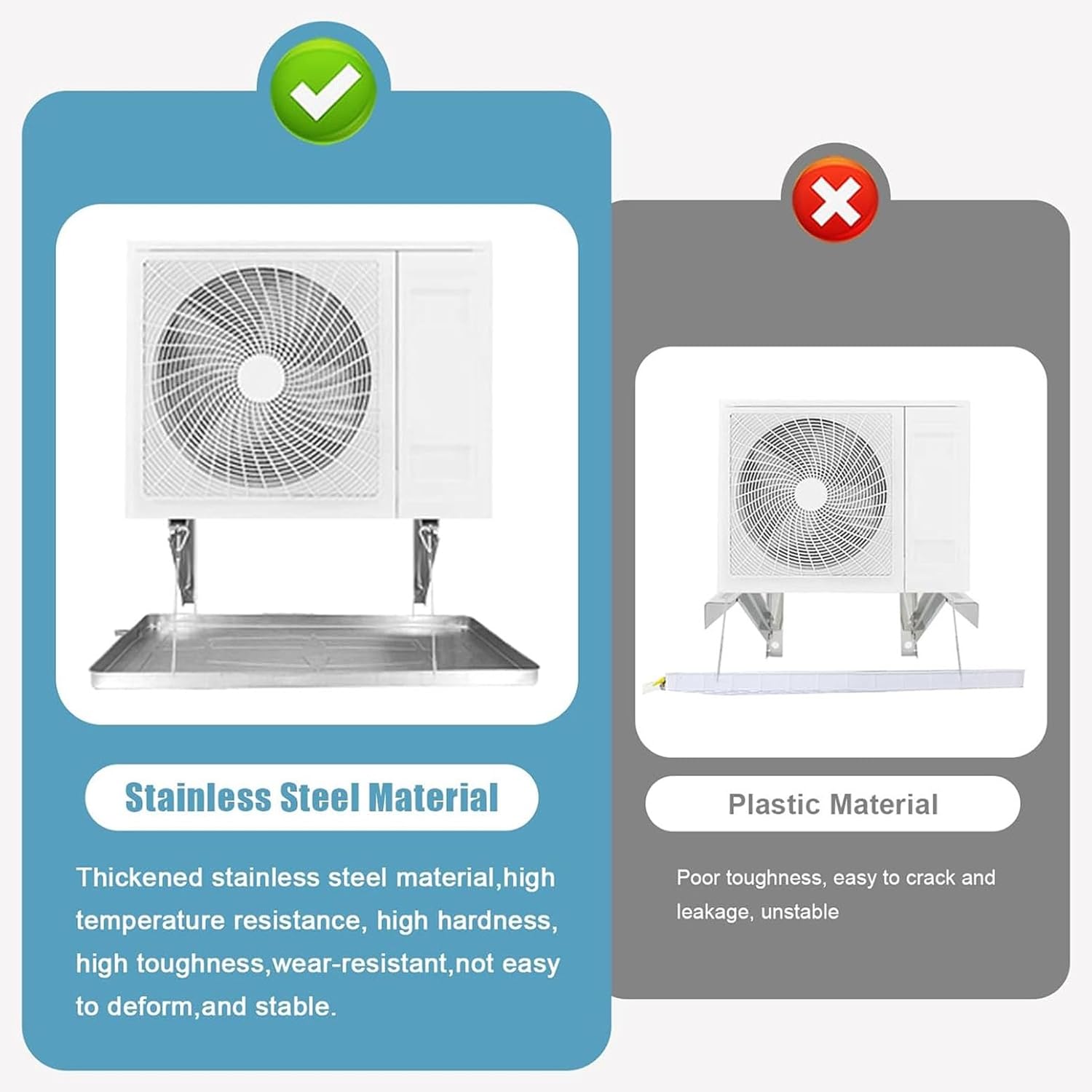 - Enhanced Stability – Our innovative bracket design minimizes wind lift, providing a more reliable solution compared to traditional wire-only options. - Durable Rust-Proof Stainless Steel – Crafted for long-lasting performance, this drain pan is built to withstand the elements and provide dependable service for years to come. - Property Protection – By effectively managing condensation, this drain pan helps prevent expensive water damage to your air conditioner's components, your home’s siding, foundation, and landscaping. Preserve your property’s value and curb appeal. - Universal Fit – Designed to accommodate a wide range of systems, our drain pan is suitable for 1P, 2P, and 3P split/window ACs, heat pumps, and evaporator coils. Specifications: - Product Name: Air Conditioner Outdoor Unit Drain Pan Choose the size that fits your air conditioner: 1-2P air conditioner: 84 x 39 x 3.5cm (33 x 14.9 x 1.3in) 3P air conditioner: 93 x 44 x 3.5cm (36.2 x 17.3 x 1.3in) Note: The tray size should be slightly larger than the outdoor unit of your air conditioner. Package Includes: 1 Pair of Galvanized Steel Brackets 1 Stainless Steel Drain Pan 1 Hose (300cm / 9.8ft) 1 Hose Clamp