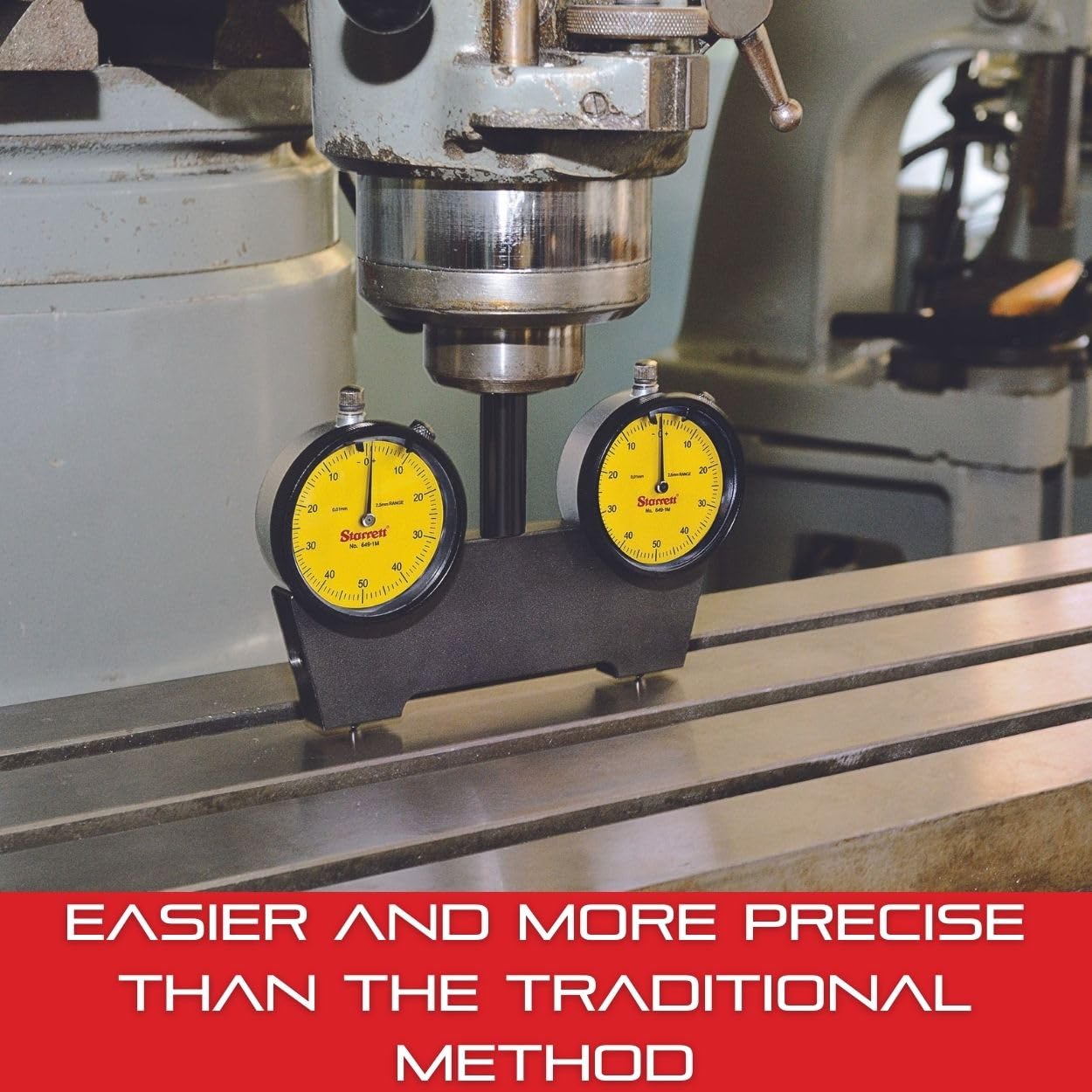 The Starrett 649 Series Spindle Square offers accuracy, convenience, and significant time saving with the common shop task of tramming the head of a vertical milling machine. It is fully assembled with two AGD Group 2 dial indicators, has a patented design, solid steel body construction with a durable black oxide finish, ground gaging surface, 3/8" inch shank diameter, 4" (100mm) between contact points, is approximately 4 lbs with custom case and approximately 6-3/4" (172mm) wide and 5-1/2" (140mm) from the top of the shank to the end of the contact points. This must be done regularly to ensure squareness and perpendicularity between the spindle and the work surface. The spindle square is easier to use and more precise than the traditional method of tramming with a dial test indicator. It has 0.01mm graduations, a 0-50-0 dial, and a 2.5mm range.