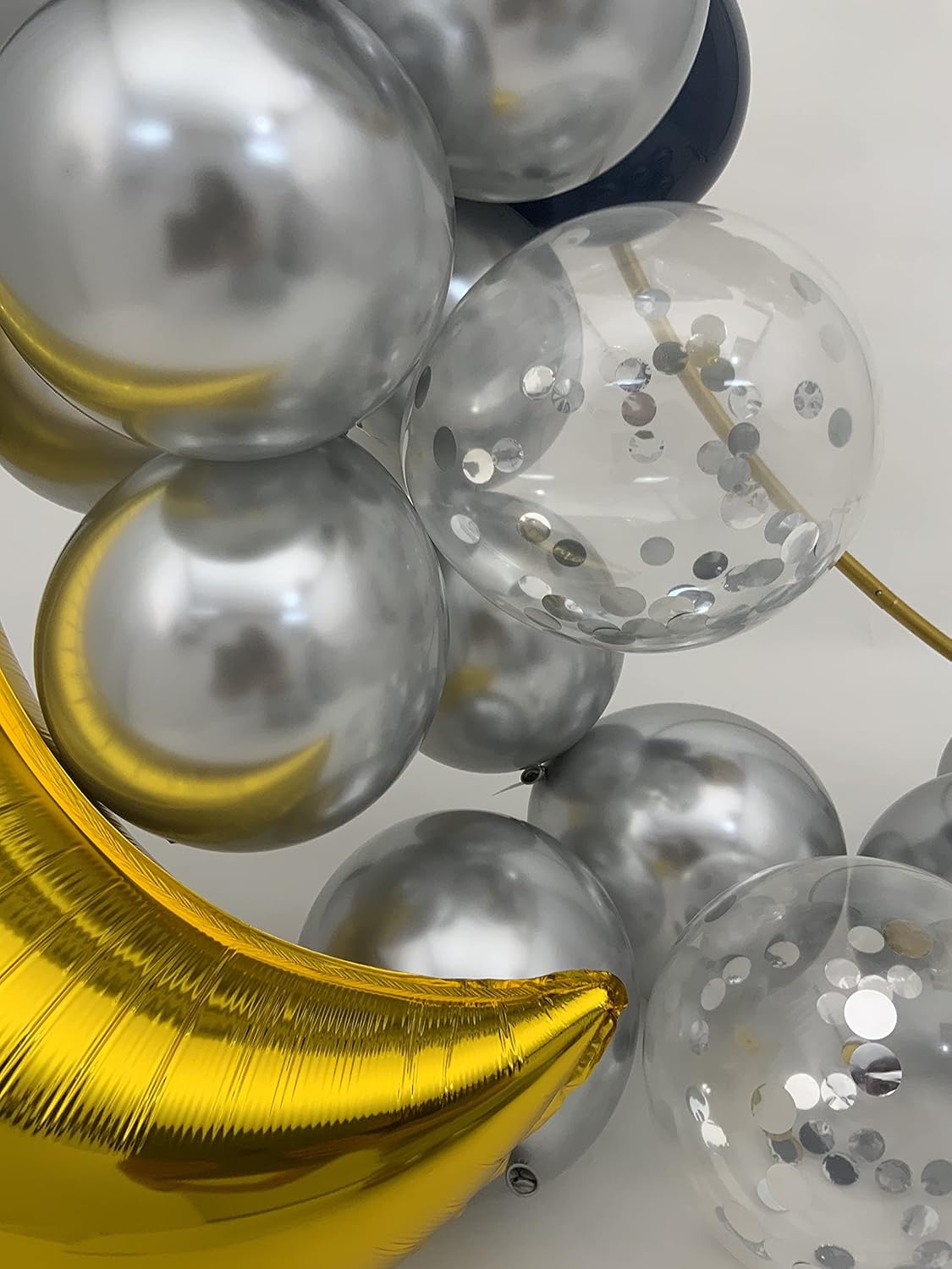 Add some joy to your birthday party, baby shower, Eid, Ramadan or other occasions and make your family and guests have a memorable day. This beautiful and one-of-a-kind garland and arch decoration set to will help you celebrate your special moments. Your guests and family will love these latex and foil balloons. This package includes -one 36-inch Gold Moon Fail balloon, -two 18-inch Silver Star Foil balloons , -two 10-inch Silver Star Foil balloons, -three 10-inch Silver-Confetti Latex balloons, -six 10-inch Metallic Gold Latex balloons, -thirteen 10-inch Metallic Silver Latex balloons, -twenty five 10-inch Navy Blue Latex balloons, -one balloon tape strip, -one balloon dot glue. Straw and ribbon are also included in the set.