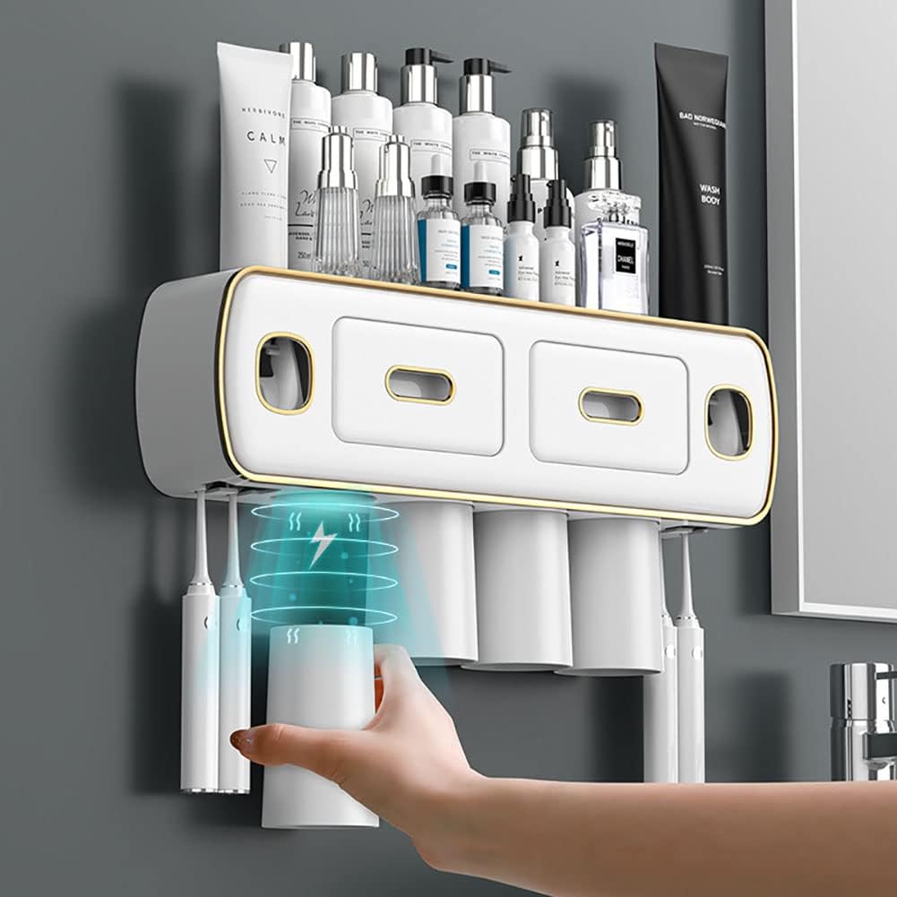 Product Description: *Size:L10.6 x W3.1 x H4.6(INCH) * 100% The bathroom toothbrush holder has super storage capacity ,1 large tray, 2 drawers,2/3/4 cups,4 toothbrush slots, 2 toothpaste squeezers. *The toothbrush holder is made of high standard ABS material, with a stylish appearance, no odor and non-toxic. We stand by our product quality and high level of customer service. With beautiful packaging, it will be a great gift for family and friends. * Please note that this sticker is only suitable for surfaces such as smooth tiles, wood walls, smooth marble, smooth glass, frosted glass, smooth metal, etc. Note: Apply the non-marking sticker and wait 24 hours before hanging the toothbrush holder.. About us:ShinOya use the best, fashion-forward designer to deliver this unique, creative protective case .We has always devoted itself to providing fashion and superior products with the end-users, so that you could enjoy the leisure shopping experience at the same time. Moreover, we have been working hard to seek out various funny products together with unique customer service, to make the customers gain more enjoyable shopping experience. Included parcels: - 1*Toothbrush Holder 1*Non-Marking Sticker 2*Cup