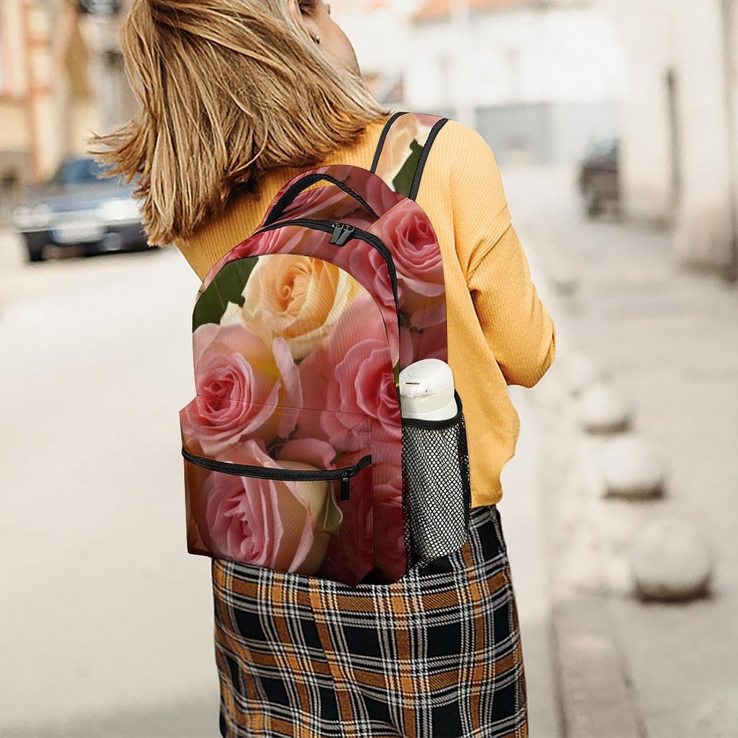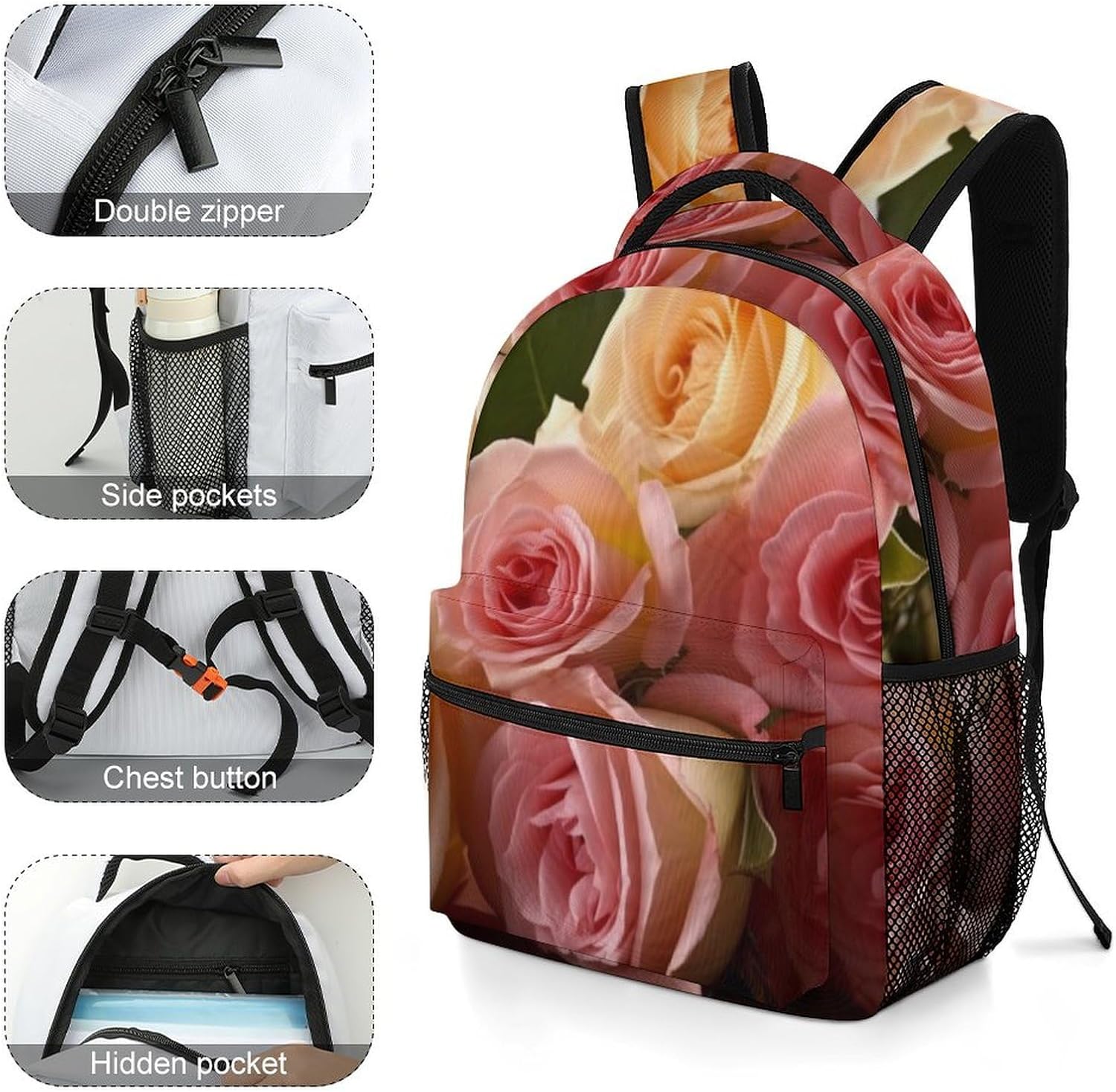 Large Travel Laptop Backpack For Women, Airline Approved Personal Item Bag, Water Resistant Lightweight Daypack Carry On Backpack, 16.5 Inch Travel Backpack, Waterproof Casual Overnight Bag, Roses Flower Hiking Backpack, Expandable Airplane Approved Weekender Bag for Men and WomenThis Roses Flower Carry on Backpack feature high-density waterproof material and sturdy metal zipper make travel bag last longer. This extra large backpack offers more packing capacity up to 30L for your travel. Main compartment has enough storage room to store clothes and daily necessities. The double zipper closure helps you go through the security check quickly. The Roses Flower luggage backpack is constructed to be most comfortable. Breathable sponge mesh design on the backside and shoulder straps help for the heat elimination and this bag equipped with an adjustable chest strap, provides a better wearing experience help relieve the stress from your shoulder. Use it as a weekender backpack, hiking, camping, plane trip, business backpack or casual daypack backpack.