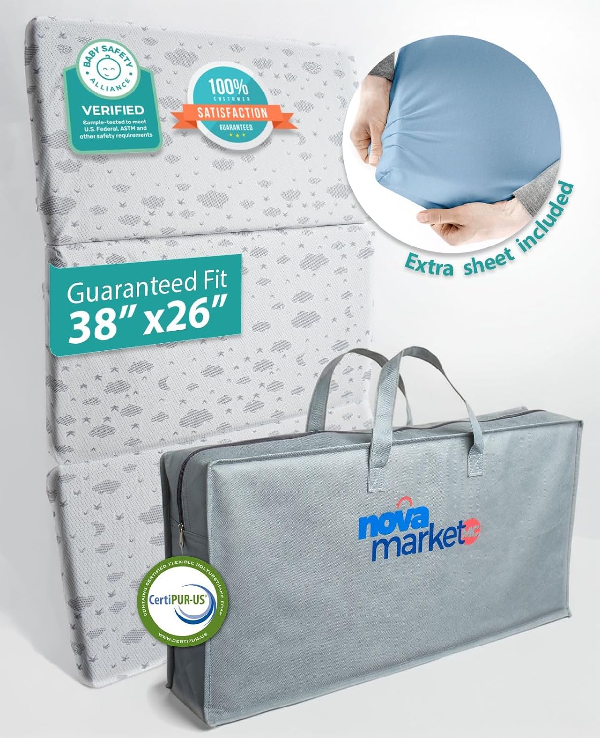NovaMarketMC tri-fold pack and play mattress pad is the perfect travel companion for your little one and You. 3-Piece-Set includes: Mattress pad, Cotton Sheet and Carry Bag. Designed to fit standard 38"x26"x1.5" pack and play dimensions, it provides a soft and comfortable sleeping surface on the go. The adorable cloud and star pattern creates a cozy environment for your baby. Crafted from high-quality materials, this mattress pad offers superior cushioning and support for restful sleep. Hypoallergenic. Easily portable and machine washable (cover and sheet) for hassle free care, it's an essential accessory for families on the move.