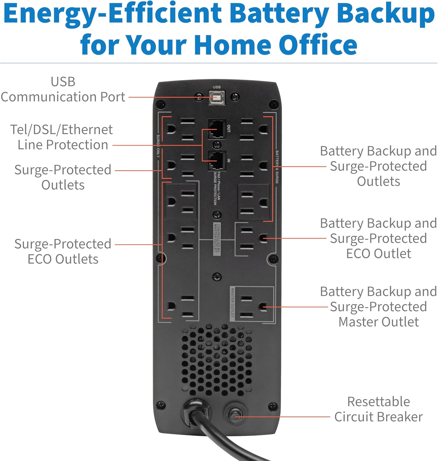 Compact Energy-Saving UPS 1300VA/720W USB Battery Backup for PCs or Home Theater Systems: This 120V line-interactive AVR UPS system provides reliable battery backup and AC power protection against blackouts, brownouts, surges and line noise that can damage valuable electronics or destroy data. The 10-outlet UPS is ideal protection for your home office or media center components, including computers, routers, printers, NAS drives, HDTVs, Blu-ray players, game consoles, media players, DVRs and audio receivers. Allows Time to Back Up Critical Files During a Blackout: Backup support allows you to work through short power failures, and gives you enough time to safely save files and shut down your system in case of a prolonged blackout. Backup time varies according to load, but the line-interactive UPS system should keep an energy-efficient desktop computer with LCD monitor powered as long as 75 minutes. During normal operation, incoming utility power keeps the UPS battery fully charged, so backup power will always be available. The hot-swappable internal batteries can be replaced by the user. Connects Your Equipment to 10 NEMA 5-15R Outlets: Five 5-15R outlets provide both battery backup and surge protection for your computer, monitor and other crucial components. The other five 5-15R outlets are surge-protected only for printers, scanners and other non-essential equipment. Two outlets—one battery/surge and one surge-only—are spaced apart from the others to accommodate bulky transformers. Four are ECO outlets designed to save you money and protect the environment (see below). ENERGY STAR-Certified to Help You Save Money and Protect the Environment: By meeting strict EPA efficiency guidelines, this ENERGY STAR-certified UPS system helps you save money and energy. An ECO power-saving option features four ECO outlets—three surge-only, one surge- and battery-protected—that turn off automatically when the device connected to the Battery Backup Master Outlet is powered down or in sleep mode. These outlets are recommended for printers, desk lamps and other non-essential peripherals that don’t need to be operational all the time. Even Backs up Essential Data When You Aren’t Around: Use the included USB cable to connect the USB-B port to your computer. Working with free downloadable PowerAlert® software, this optional feature can enable safe unattended system shutdown and file saves in the event of a prolonged power failure when you aren’t around. Automatic Voltage Regulation (AVR) Corrects Low-Voltage Conditions: AVR protects your equipment from incremental hardware damage, data loss and performance problems caused by brownouts. The ECO1300LCD can correct brownouts as low as 86V back to nominal 120V power without drawing on the battery backup needed to support your equipment during a blackout. 316 Joules Fight Back Against Unexpected Power Surges: A 316-joule surge suppression rating protects connected components from the harmful effects of power surges. Dual network data line surge suppression jacks protect a wired peripheral from dangerous surges on a single 10/100Base-T or dial-up network connection. USB Charging Ports Keep Mobile Devices Fully Powered for Immediate Use: Two 5V USB ports share 2.1 amps of maximum charge current for charging smartphones, tablets, MP3 players and other essential mobile devices compatible with USB chargers. These ports are intended only for USB charging, which is available when the UPS system is turned on and receiving utility power. Combats Electromagnetic Interference That Can Harm Equipment: Various electromagnetic and radio sources found in virtually every home and business can cause disruptive interference on the AC line. Known as EMI (electromagnetic interference) and RFI (radio frequency interference), this line noise is a common cause of performance problems and can lead to incremental hardware damage, data corruption and audio/video transmission problems. The ECO1300LCD incorporates technology that filters out disruptive line noise so that it won’t affect your equipment. Easy-to-Read LCD Reports Real-Time UPS and Power Status: The front-panel LCD displays a variety of UPS and site electrical conditions, including UPS operating mode, voltage, frequency, load level, battery charge level, wiring fault and estimated runtime remaining. A built-in audible alarm sounds to warn you of a low battery or overload conditions. Tower Form Factor for Easy Placement in Your Workspace or Media Center: The long-lasting ABS housing fits easily on a desktop, shelf or anywhere else convenient to your workstation or home theater. The six-foot power cord connects to a properly grounded AC wall outlet. The right-angle NEMA 5-15P plug allows easier connection in tight spaces.