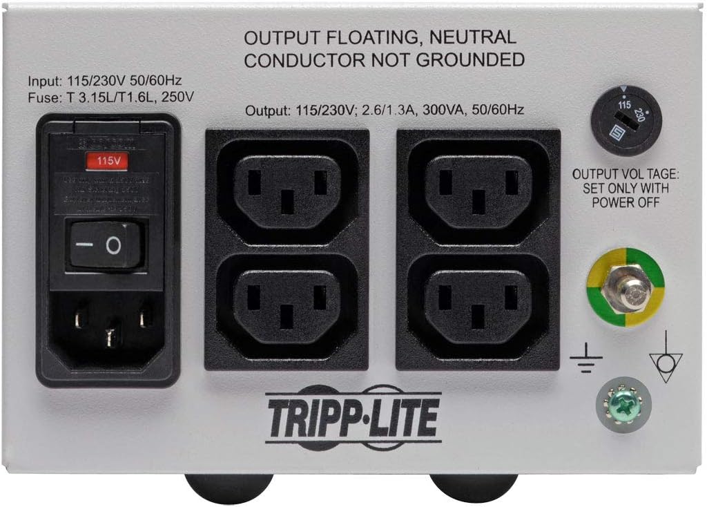 The IS300HGDV isolator® Series dual-voltage 115/230V 300W 50/60Hz medical-grade™ transformer with Full can/features/IEC/EN 60601-1 listing is ideal for protecting sensitive electronic equipment in patient-care vicinities. It can be configured for either Step-up voltage, step-down voltage or pass-through voltage operation. Along with line isolation and continuous EMI/RFI line noise filtering, its surge protection rating of 240 joules suppresses excess voltage to prevent it from damaging connected equipment.An internal low-impedance isolation transformer component offers 100% Isolation from the input mains AC line. Faraday shield reduces the cumulative leakage current of the IS300HGDV and connected equipment to levels less than 50 Micro amp, while removing utility switching transients and harmonics generated by other on-site loads and reducing the impact of utility or Lightning related surge conditions. Transformer filtering provides continuous common-mode noise rejection with no wearable parts. The IS300HGDV reduces 6000V IEEE 587 Category a and B ring wave and combination wave test surges to only 0.5V common mode. Components connect to four C13 outlets with fuse overload protection and a lighted on/off switch. The rugged all-metal unit housing ships ready for placement in any industrial, medical, Office, network or audio/video environment. Requires a c14-to-c13 AC input cord (sold separately). Manufacturer: Tripp Lite. Manufacturer Part Number: IS300HGDV. Brand Name: Tripp Lite. Product line: isolation. Product Model: IS300HGDV. Product Name: isolation IS300HGDV isolation transformer. Product Type: isolation transformer. [Technical Information] power rating: 300 VA. Input receptacles: IEC 60320 C14. Output receptacles: 4 x IEC 60320 C13. [Power Description] input Voltage: 120 V AC. 230 V AC. Output Voltage: 115 V AC. 230 V AC. Maximum line current: 3.15 A. [.