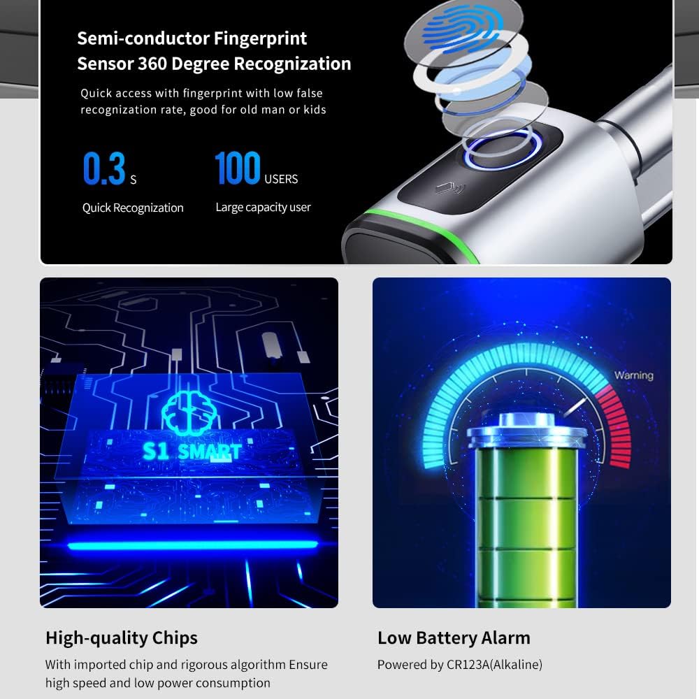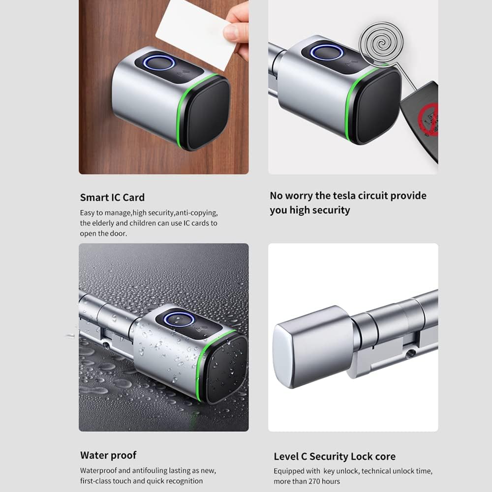 Tuya intelligent door lock ports mulle unlocking methods, APP/fingerprint/al key/IC card to make your lifes smarter. Easy to install, high ty level, perfect for homes, offices, hotels, apartments, etc. Mulle Unlock Methods: Intelligent door lock, port 4 unlocking methods, APP, fingerprint, al key and IC card, making your lifes more convenient. Remote Unlock: Use with Tuya APP, you can remote unlock the door for quick access, check the member, unlock records, setting, etc., with high ty levels. Sensitive Recognition: With semi-condictor fingerprint sensor, quick access with fingerprint with low false recognition, nice for old men or kids. Emergency Power: Powered by CR123A battery(not included), no need to plug in, with Type-C interface, when the battery is dead, it can in time. Automatic Locking: The door lock will automatically lock after 5 seconds of unlocking, more secure. You can turn off the function on Tuya APP, which is turned on by default. Wide Application: Practical door lock, perfect for homes, offices, hotels, apartments, etc. Waterproof design, it can be used for outside doors. Specifications: Color: Black / Silver(optional) Material: Aluminum Alloy + Brass Unlock Way: APP, Fingerprint, Keycard, Manual Key IP Class: IP5X Reader Dimension: 42 * 42mm Door Thickness: 35-50mm Package Size: 255 * 100 * 70mm/ 10.0 * 3.9 * 2.8in Package Weight: 490g/ 17.3oz Packing List: 1 * Door Lock 2 * Keycard 2 * Manual Key 2 * Sucker 1 * Wrench 1 * Manual