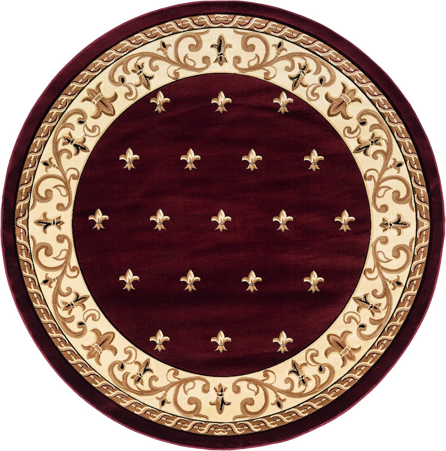 Luxury and elegance encompass this exquisite transitional rug. Using a rich burgundy colored background with a neutral beige and gold fleur de lis design will be the perfect addition to your room décor for an eloquent appeal. This stunning machine-made rug has a hand carved design and is stain and fade resistant for your lifestyle needs.