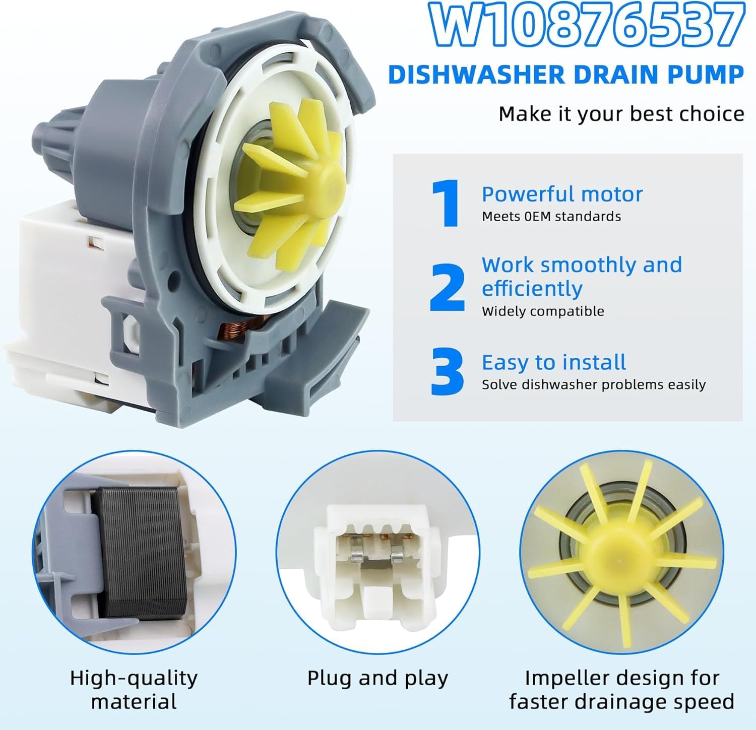 | Included Components | 1*W10876537 Dishwasher Drain Pump; Dishwasher drain pump W10724439 is made of high-strength materials and well-tested by the manufacturer - Meets 0EM standards. Solve the following washing machine problems for you: making noise;not draining; dishwasher not washing properly; dishwasher leaking and other similar problems. |