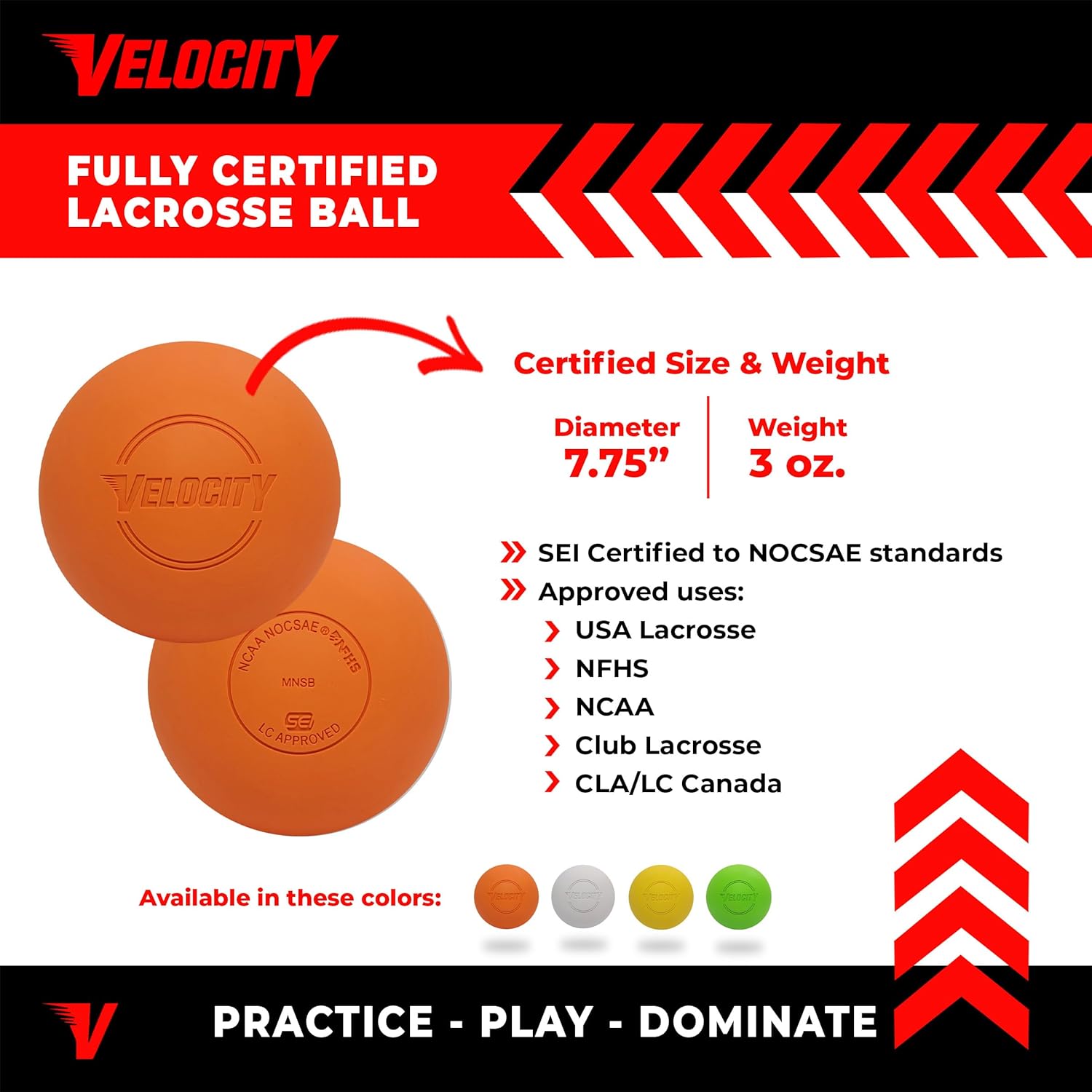 • HIGH PERFORMANCE - Velocity lacrosse balls are made with molded rubber construction, making them perfect for training, tournament, and competitive game play. Velocity lacrosse balls have the quality and craftsmanship you want every time you’re stepping out onto the field or box.