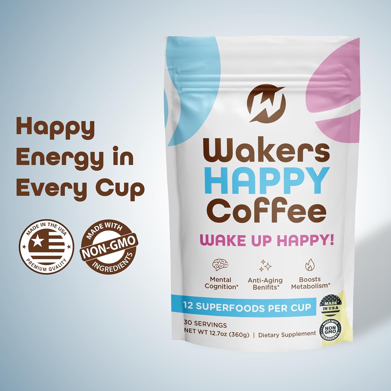 WakersHAPPYCoffee️ Energy, focus, anti-aging, metabolism support. Keto-friendly, sugar free, soy-free. Instant Plant-based (30 Servings) 12 Superfoods (Matcha, Turmeric, Maca Root, Cordyceps, Shiitake, Chaga, Ginseng, Cocoa, Cinnamon, Green Coffee, Ginger, Green Tea) Immune Support, Gut Health, Focus, Wellness, Functional, Vital, French Roast, Fair Trade, Non-GMO, GMP-Certified, USA Made, Small Business, Woman Owned, Veteran Owned, Mocha Flavor | Nootropic | 10.6oz Bag