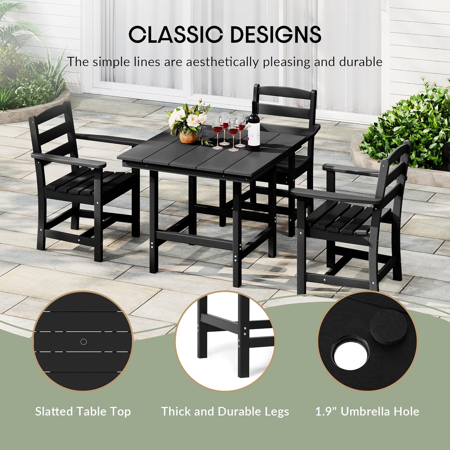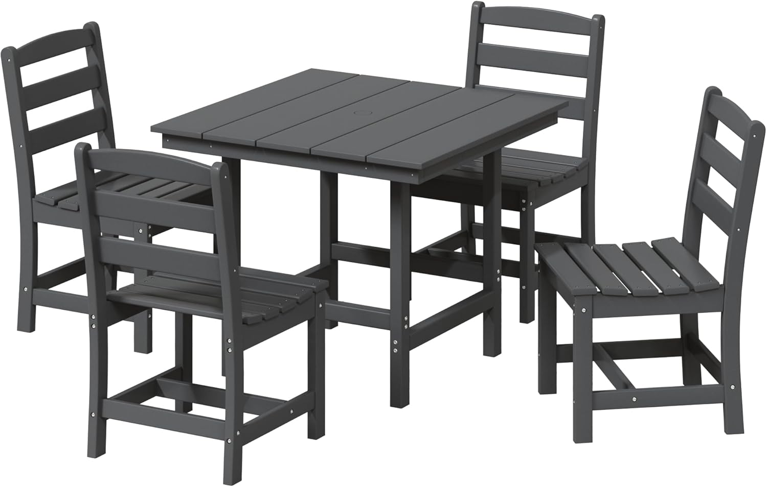 Drink and eat with your family and friends around this quaint 5-piece HDPE patio dining table set. Made with durable, all-weather HDPE material, its UV and fade-resistant properties offer ideal protection against the elements. Stable and durable construction with the reinforced tabletop construction with the 1.9" built-in umbrella hole and the side chair's durable leg construction that ensures this set is built to last for years to come. Make your summer the perfect summer with this HDPE dining set.