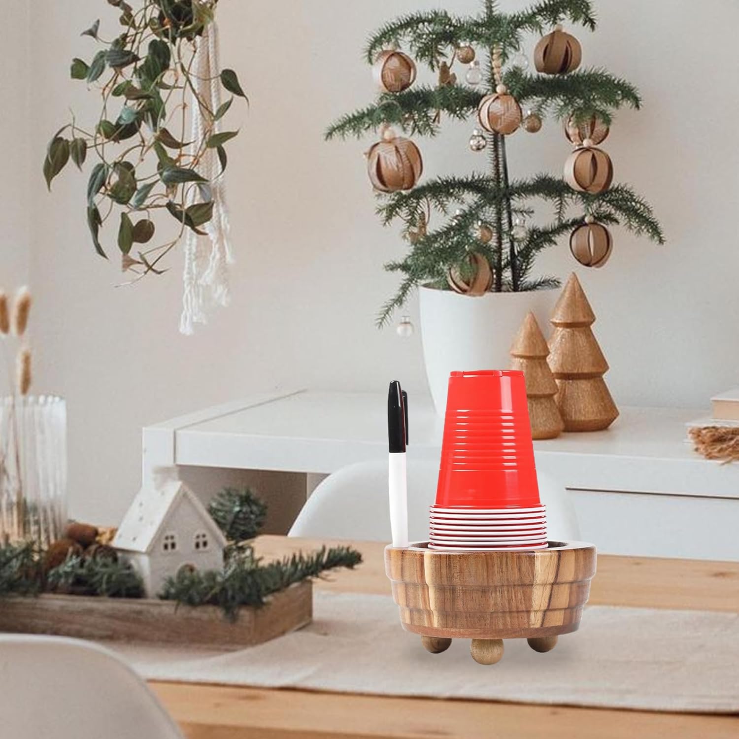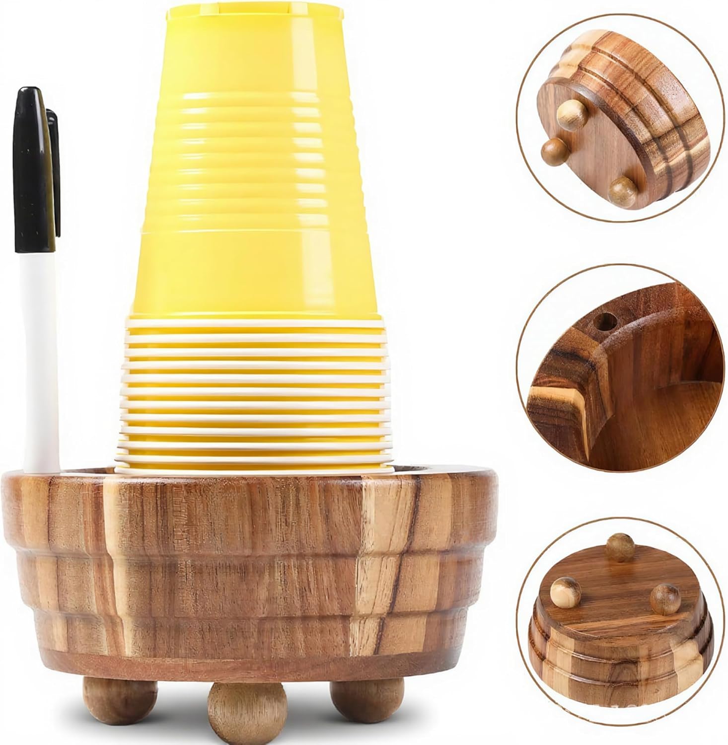 Description: This wooden solo cup holder with a built-in marker slot is the perfect rustic accessory for elevating your party, bar, kitchen, or bathroom setup. Designed to securely hold paper cups while providing guests with a convenient way to mark their cups using the integrated marker slot, it minimizes confusion and promotes hygiene during social gatherings. Crafted from quality wood, the cup holder not only brings reliable support but also adds a charming and natural aesthetic to any environment. Its multifunctional storage feature keeps markers or other small items organized, ensuring a tidy and welcoming space. Compact and easy to transport, this versatile cup holder is an essential hosting tool that blends practical cup organization with attractive design, making every event more enjoyable and orderly. Features:. -Color: Brown. -Material: Wooden. Note:Manual measurement, please allow slight errors on size.The colors may exist slight difference due to different screens. Package Including 1 x Cup Holder with Marker Slot